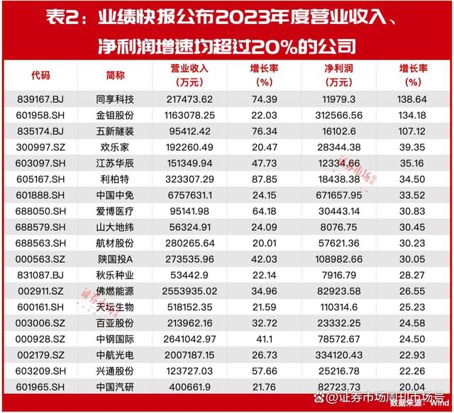 从成长性角度看,有色金属股同享科技、金钼股份、专用设备制造类公司五新隧装的净利润同比增速则更为“抢眼”,相较2022年度,均实现了翻倍增长。且统计显示,目前发布业绩快报的公司中,有94家公司全年盈利且同比增长,若进一步结合营业收入情况统计,共有76家公司营业收入和归母净利润双双增长,同享科技、金钼股份、五新隧装、欢乐家等19家公司更是两项主要财务数据增速均超过了20%。