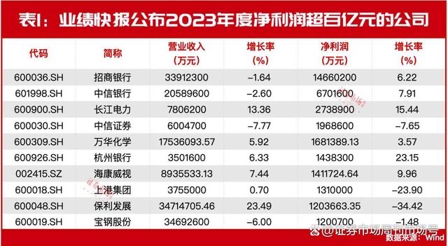 目前,共有132家公司提前于正式年报发布了业绩快报,从盈利额来看,招商银行的“赚钱”能力最强,2023年实现归母净利润1466.02亿元,相较2022年增长6.22%。另外,中信银行、长江电力、中信证券等9家公司的年度归母净利润也均超过了百亿元。