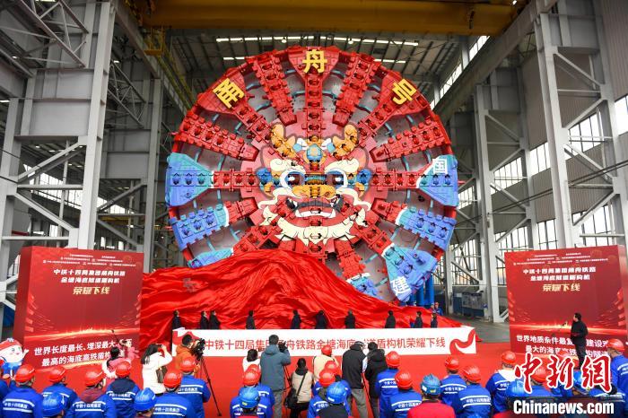 2月26日,刀盘涂装“瑞龙”图案的超大直径盾构机“甬舟号”在湖南长沙下线,将用于世界最长海底高铁隧道——甬舟铁路金塘海底隧道建设。