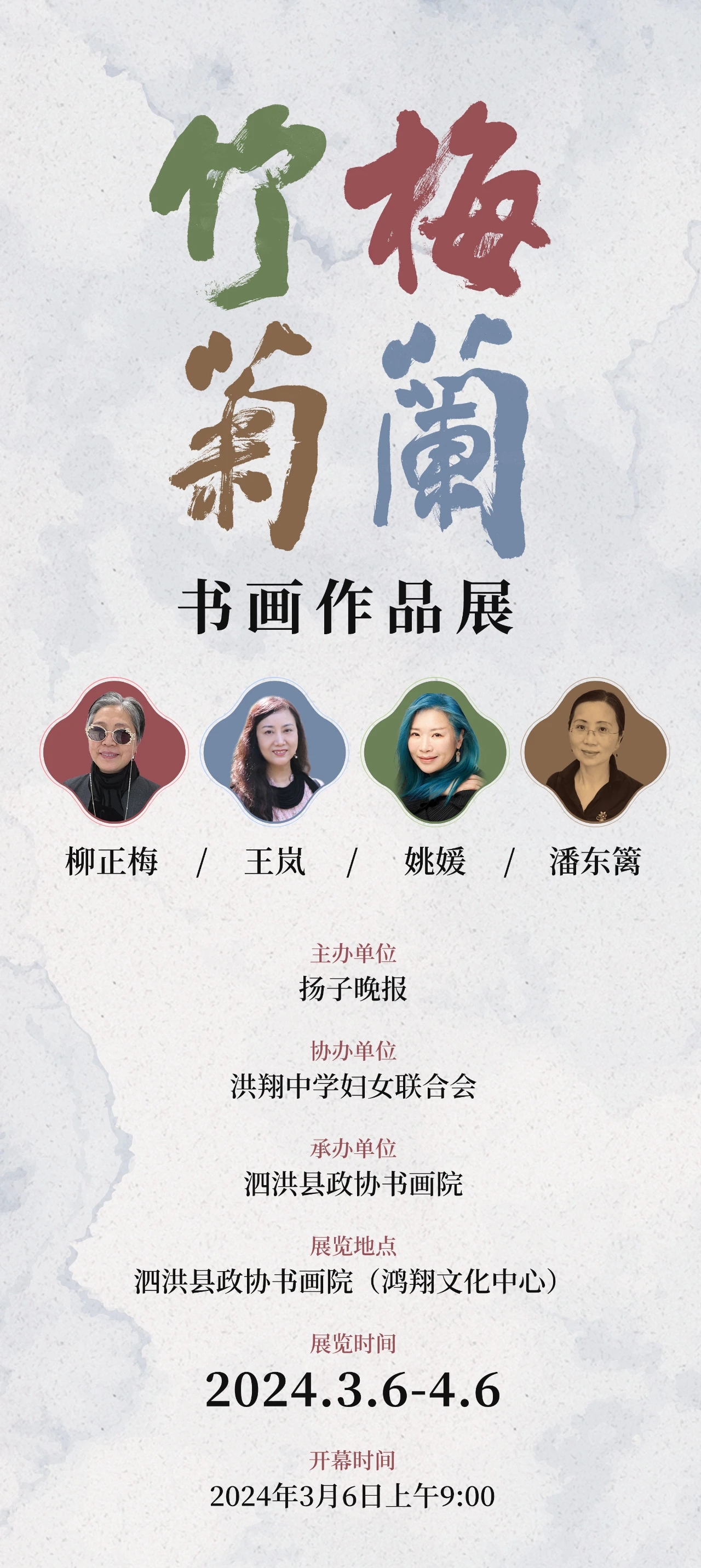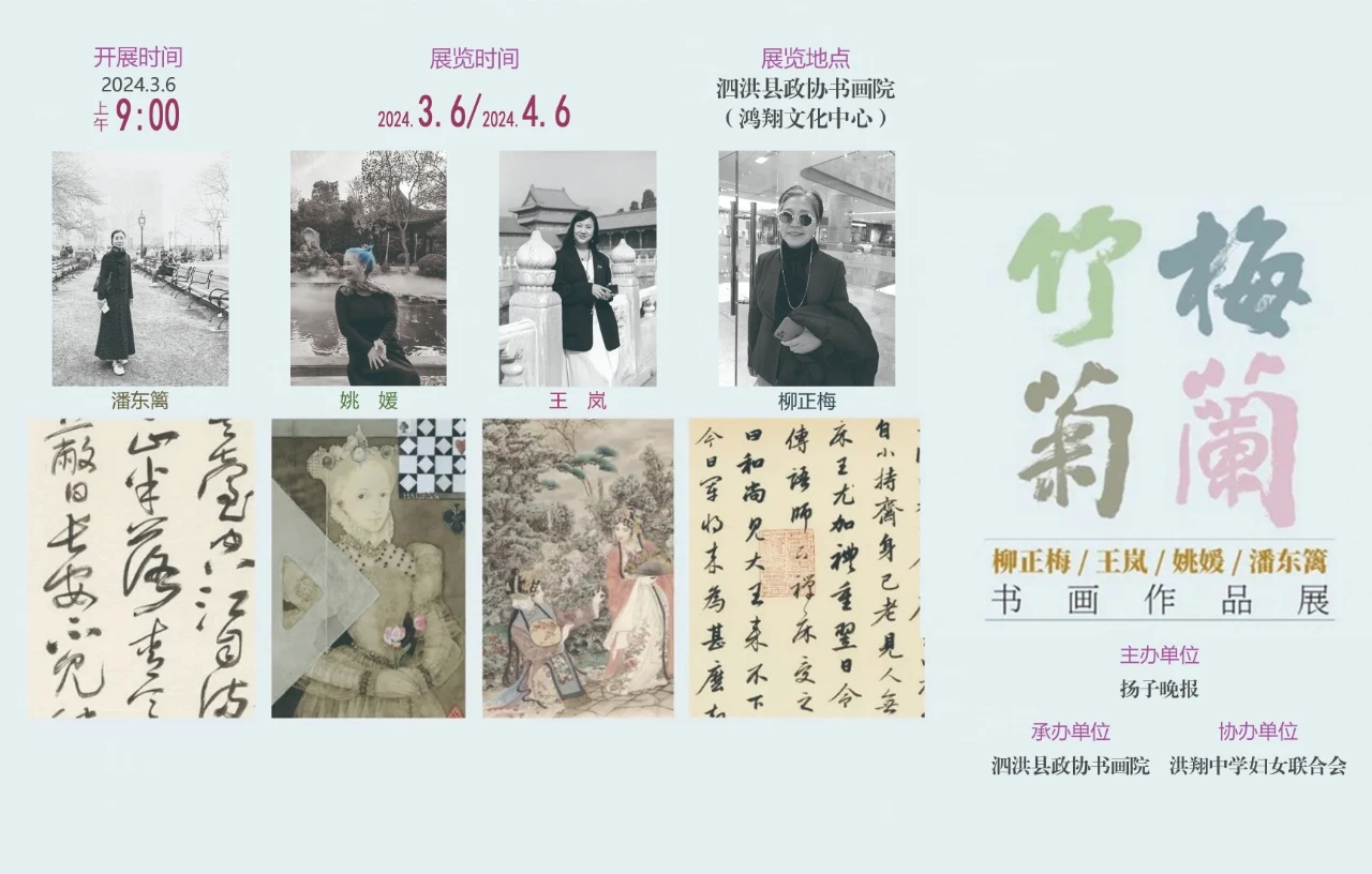 为献礼龙年三八妇女节,同时向大众推介优秀的传统文化,扬子晚报携手泗洪县洪翔中学合力推出“梅兰竹菊”古风新韵展,3月6日在泗洪县政协书画院(鸿翔文化中心)开幕。