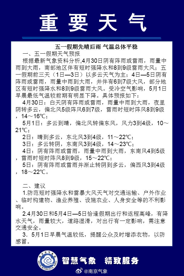 扬子晚报网4月29日讯(记者 于丹丹)南京市气象台根据最新气象资料分析,4月30日南京阴有阵雨或雷雨,雨量中雨到大雨,南部地区伴有短时强降水和8到9级雷雨大风;五一假期前三天(1日一3日)以多云天气为主;4日一5日阴有阵雨或雷雨,雨量中雨到大雨,并伴有6到7级大风,部分地区有短时强降水和8到9级雷雨大风。受冷空气影响,5月1日早晨最低气温较前期有明显下降。