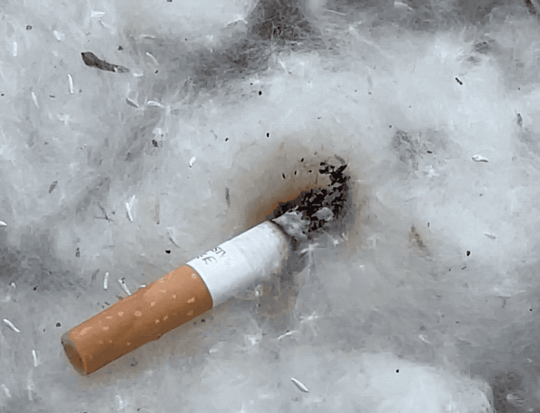 5月22日,南京消防做了两组实验。实验一:将烟头放于杨柳絮上。消防员收集了一些杨柳絮,将未熄灭的烟头放于杨柳絮上,只见杨柳絮与烟头接触的地方迅速变黑碳化,并不时有烟冒出。此时,使用热成像仪探测烟头的温度已达到500℃以上,而点燃的烟头中心温度最高可达700-800℃,可轻易引燃周边易燃可燃物。