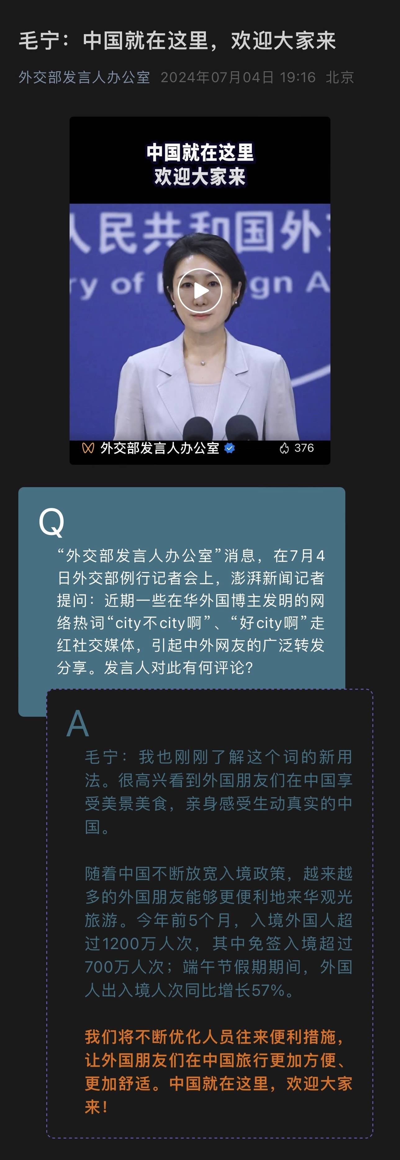 7月4日,外交部发言人毛宁在例行记者会上回答澎湃新闻(www.thepaper.cn)提问时表示:“刚刚了解这个词(city)的新用法。很高兴看到外国朋友们在中国享受美景美食,亲身感受生动真实的中国。”