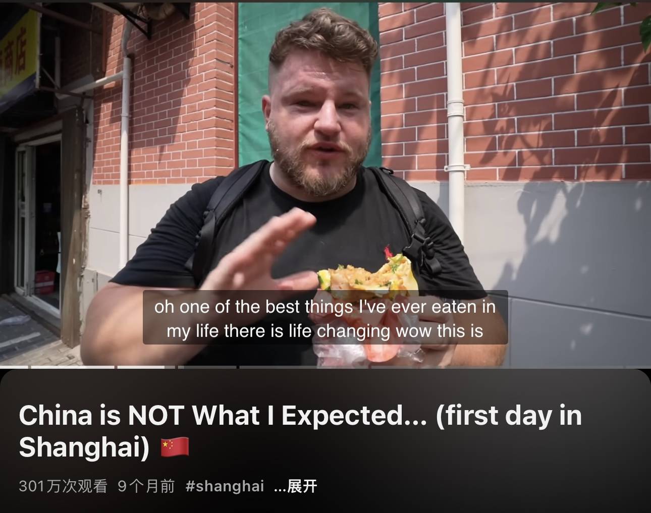 无一例外地,几乎所有来到中国的外国博主都会在视频里“宣传”中国的食物有多美味。有两位拥有超过90万粉丝的澳大利亚博主在上海弄堂咬了一口煎饼后则相继喊道:“这是我一生中吃过的最好的东西之一,改变了我的生活。”