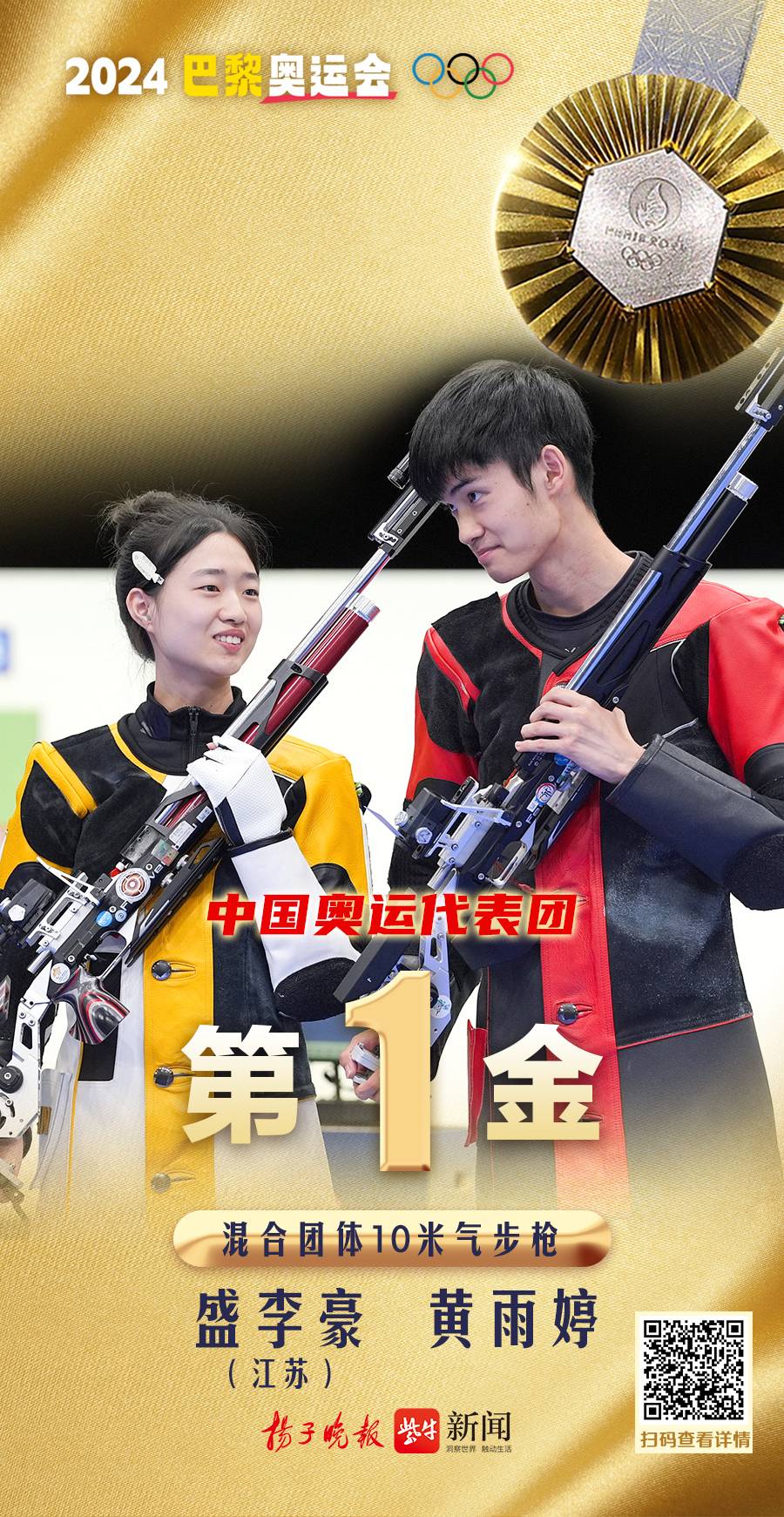 巴黎奥运会首金产生!中国队夺得射击混合团体10米气步枪金牌