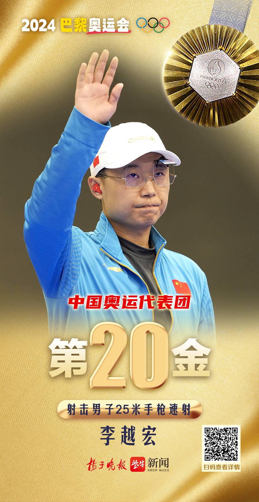 在射击赛场,男子25米手枪速射决赛,奥运三朝元老、两次获得奥运铜牌的中国选手李越宏发挥出色,首夺奥运金牌!另一位中国选手王鑫杰收获铜牌!