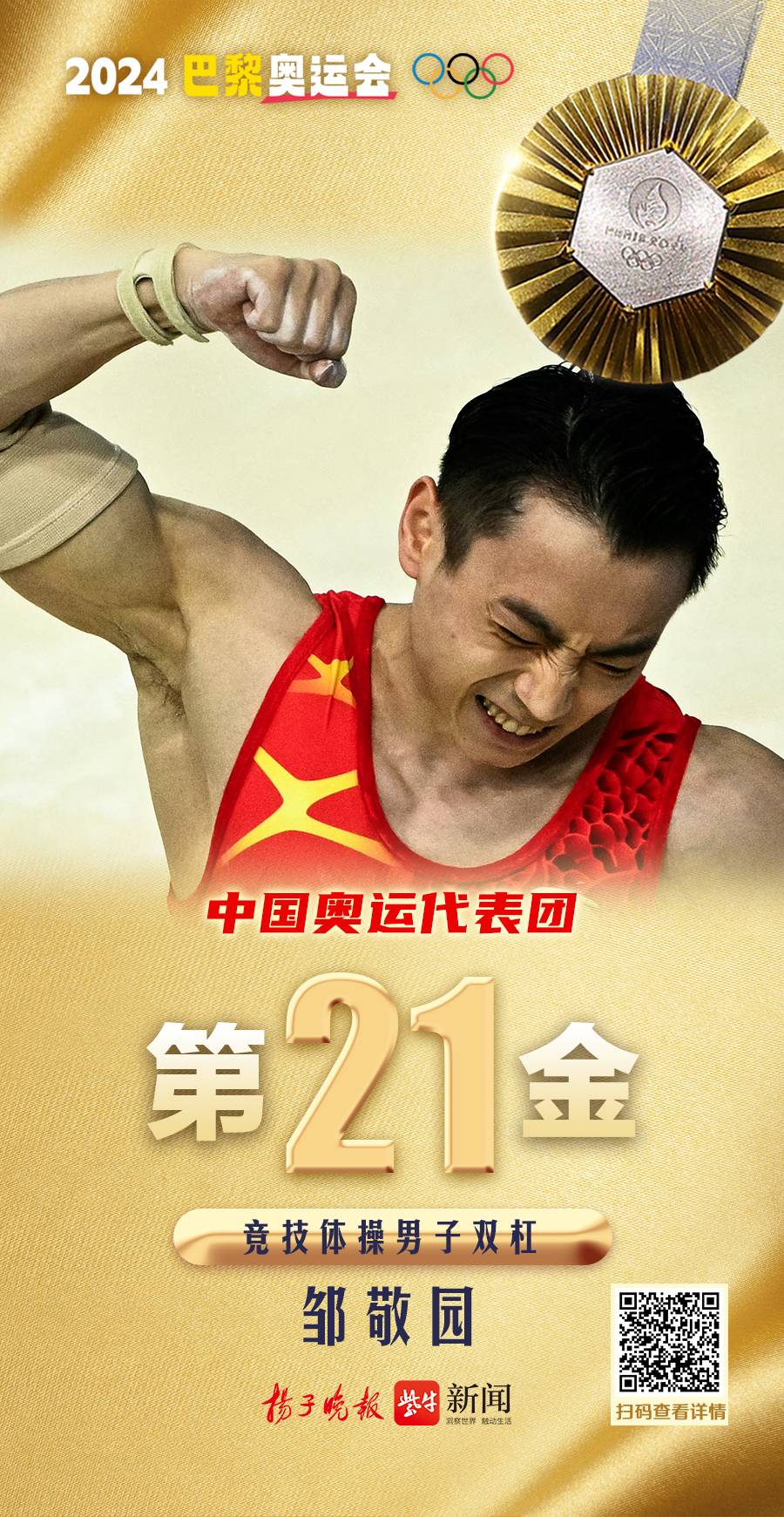 在巴黎奥运会竞技体操最后一个比赛日中,中国代表团收获颇丰:男子双杠决赛,卫冕冠军、中国选手邹敬园以16.200分蝉联金牌!另一位中国选手张博恒15.100分位列第四。