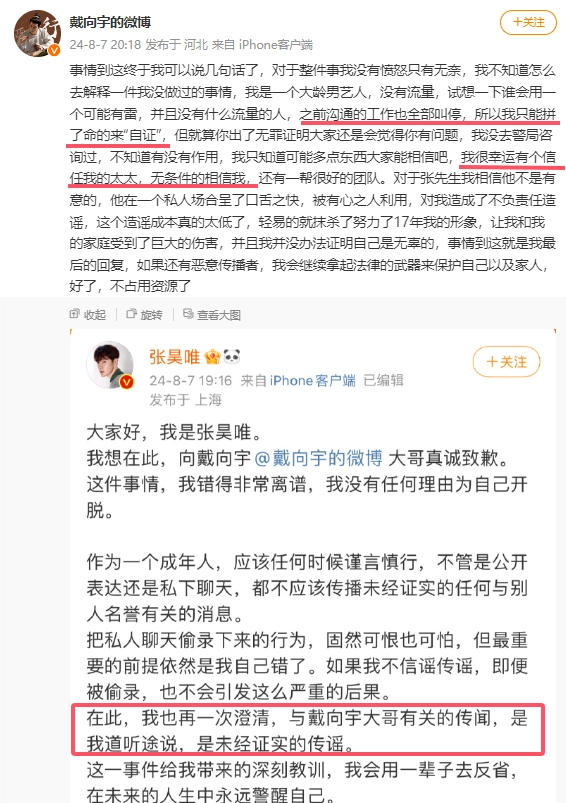 令人关注的是,8月6日,网络曝出一段疑似张昊唯和一女生的对话录音。录音中,男方曝戴向宇嫖娼,相关话题冲上热搜第一,此前演员戴向宇和妻子陈紫函拍短视频、带货,一直立的是恩爱人设,这一消息传出令人大跌眼镜。6日,演员戴向宇向张昊唯发律师函并公开无犯罪记录证明,配文:“一个毫不相干的人,俩嘴一番就会抹杀一个人一生的努力! ”律师函中称有关戴向宇嫖娼的相关言论,“完全不是事实,纯属子虚乌有!”7日,戴向宇再次发文称,工作全部叫停,只能拼了命的来“自证”。后张昊唯因“传谣”向戴向宇道歉:“与戴向宇大哥有关的传闻,是我道听途说,是未经证实的传谣。 ”