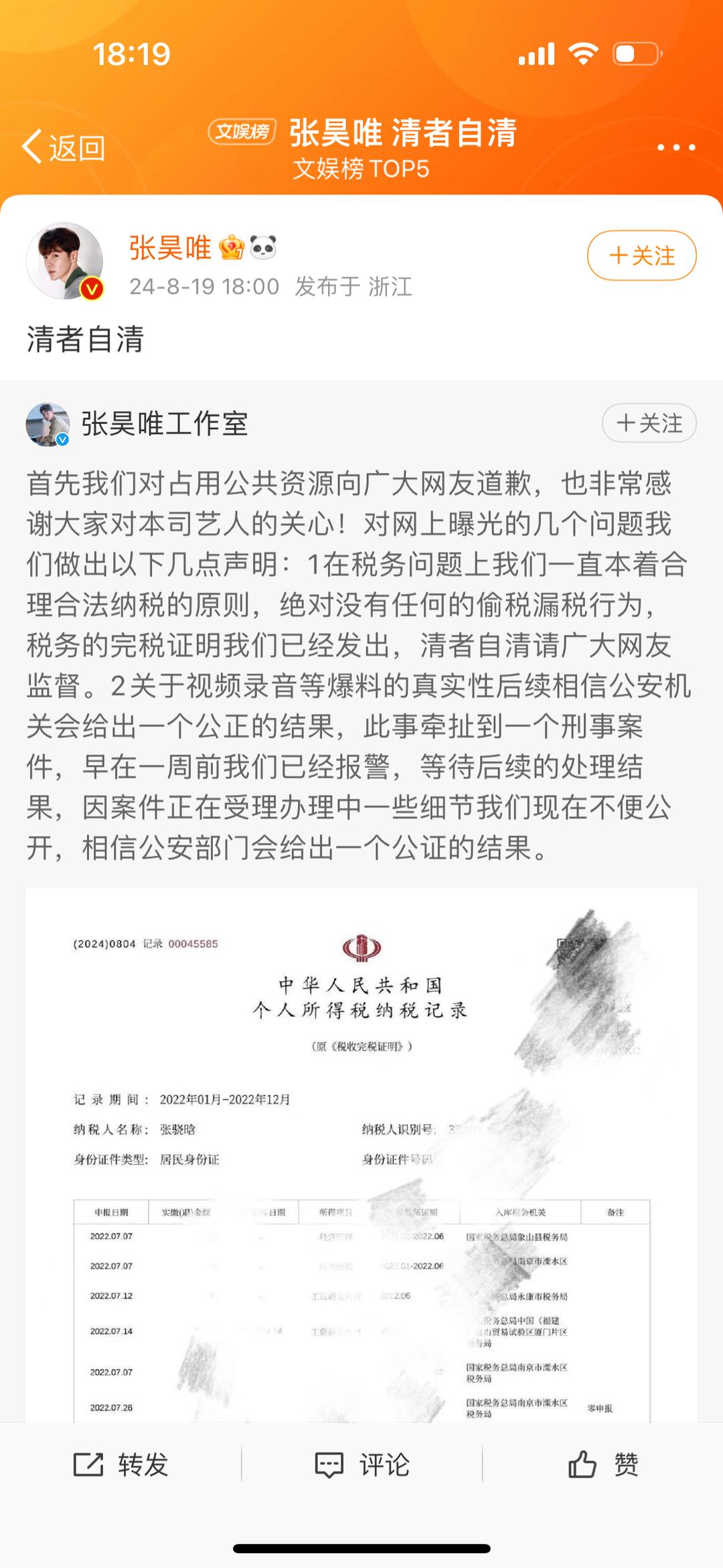 张昊唯工作室就此事做出回应:“首先我们对占用公共资源向广大网友道歉,也非常感谢大家对本司艺人的关心!对网上曝光的几个问题我们做出以下几点声明:1、在税务问题上我们一直本着合理合法纳税的原则,绝对没有任何的偷税漏税行为,税务的完税证明我们已经发出,清者自清请广大网友监督。2、关于视频录音等爆料的真实性后续相信公安机关会给出一个公正的结果,此事牵扯到一个刑事案件,早在一周前我们已经报警,等待后续的处理结果,因案件正在受理办理中一些细节我们现在不便公开,相信公安部门会给出一个公证的结果。”配图是2022年纳税记录。随后,张昊唯转发其工作室微博并回应“清者自清”。