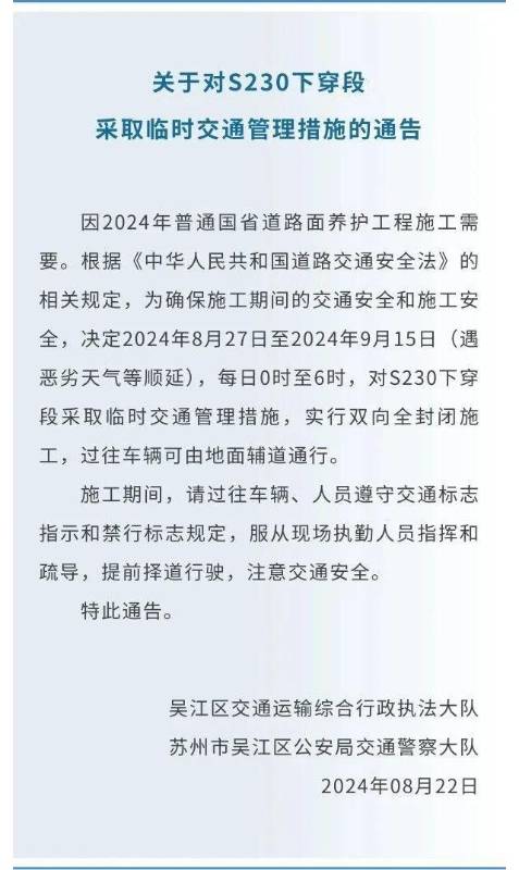 注意!因230省道下穿段路面养护工程施工需要,决定自2024年8月27日至2024年9月15日(遇恶劣天气等顺延),每日0时至6时,对230省道下穿段采取临时交通管理措施,实行全封闭施工;期间,途经230省道上述路段的车辆,由两侧地面辅道通行。