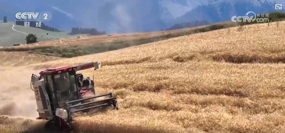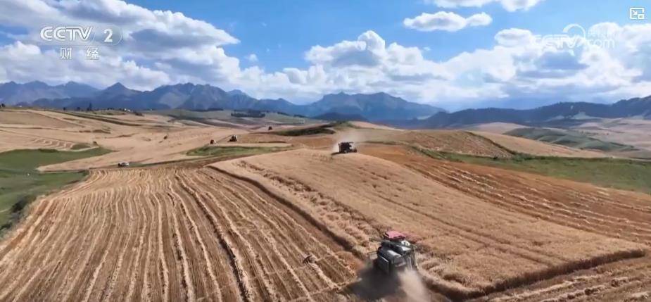 央视网消息: 江布拉克的麦田主要分布在海拔1700米的平缓丘陵地带,麦田随山势连绵起伏。这里的机械化收割作业使用的大多是中小型的轮式或者是履带式的收割机,预计8月底、9月初左右基本能完成小麦的收割。