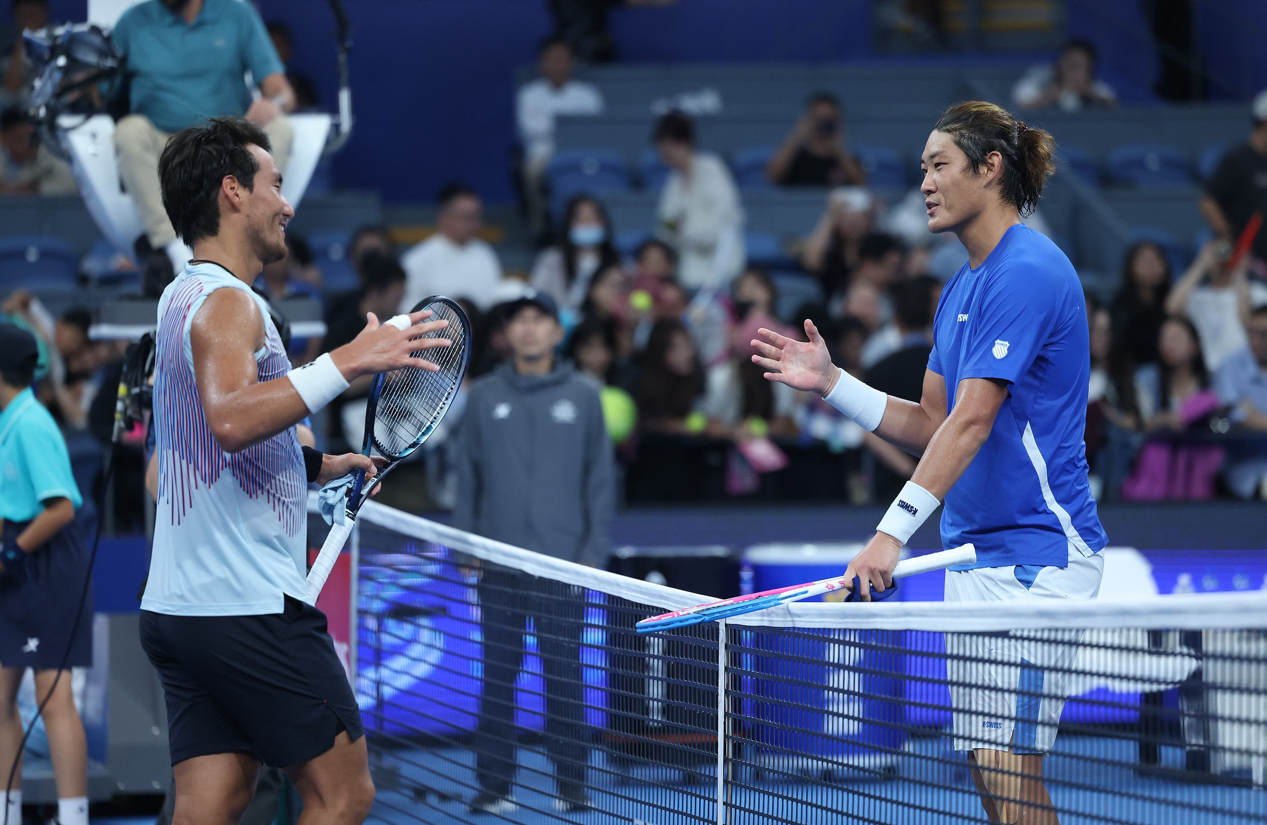张之臻(右)赛后和布云朝克特握手。