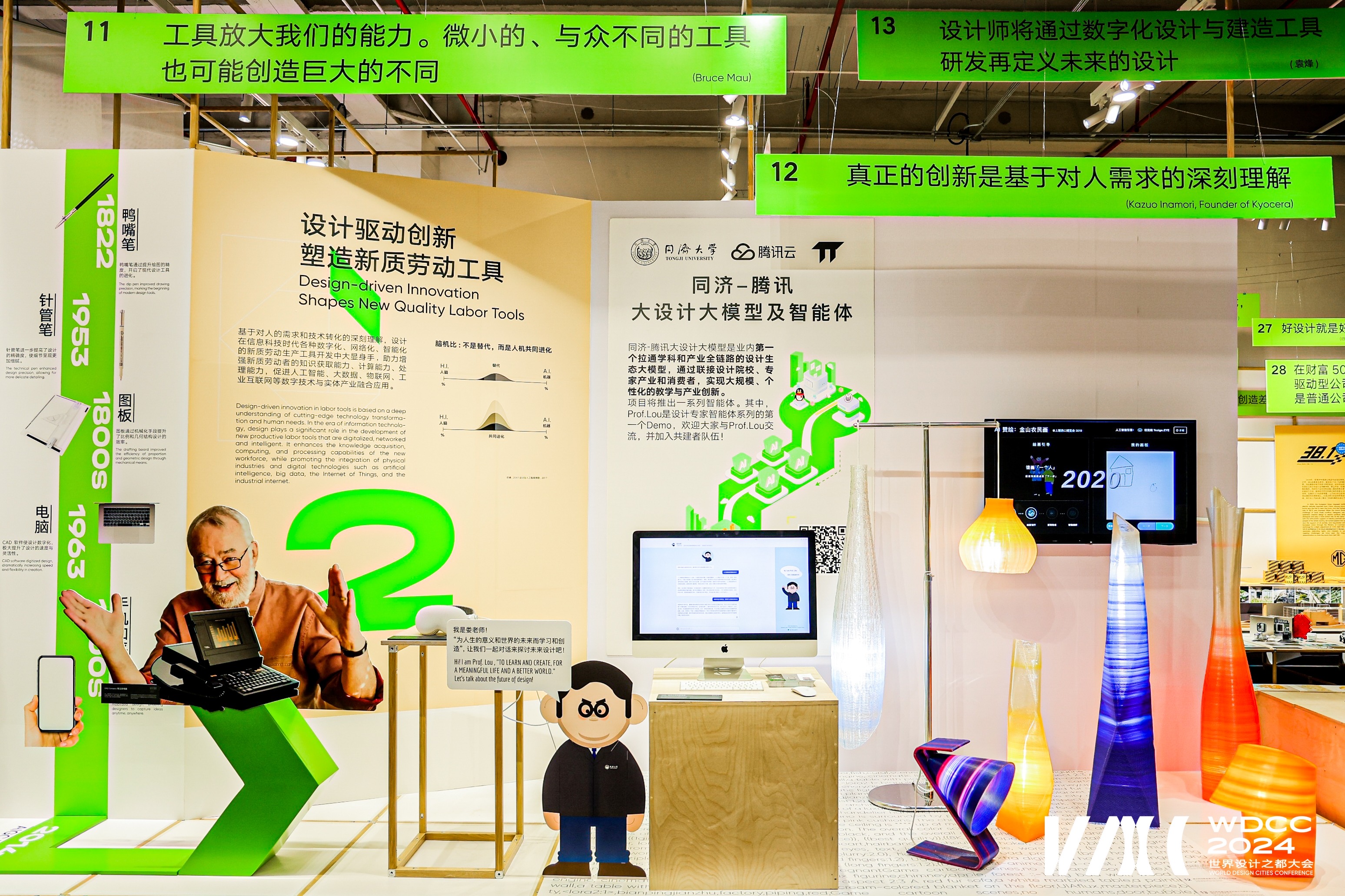 娄永琪教授的SustainX研究团队与腾讯教育团队正在共建一系列以大设计学科大模型为依托的AI智能体创作平台。在本次大会的主题展上,双方合作的第一个成果:Prof. Lou智能体首次亮相。这也是设计专家智能体系列的第一个产品原型(Demo)。该智能体收集了娄教授公开发表的著作、演讲、新闻、对话及社交媒体文本近百万字的基础语料,经过提示词工程构建、AI工作流搭建和知识库调优等多种方法的优化,目前已经可以作为专家级智能体回答各种设计相关的专业问题,并服务于教学、科普等应用场景。该智能体一经推出,便会随着用户的累积而快速迭代。通过增加训练数据、引入强化学习和多模态信息,这个智能体还将进一步加强多模态能力和从事复杂设计任务的能力。未来,该项目还将推出一系列的智能体,并实现对学科端和产业端的链接,不断丰富设计大模型生态。