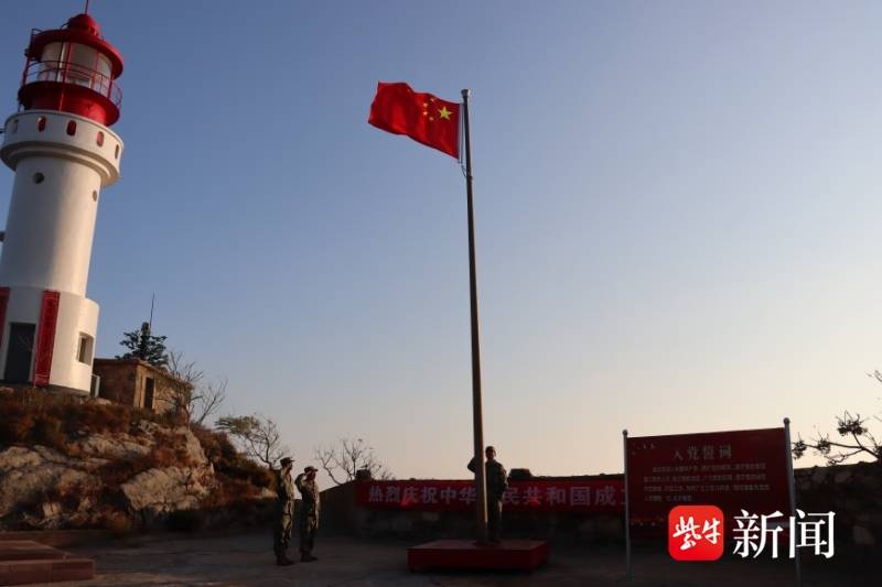 “敬礼!”10月1日早上,晨曦微露的时刻,五星红旗就在连云港灌云县开山岛上再次冉冉升起。第七批第一班开山岛守岛执勤的三名退役军人共同在这里升起了五星红旗。