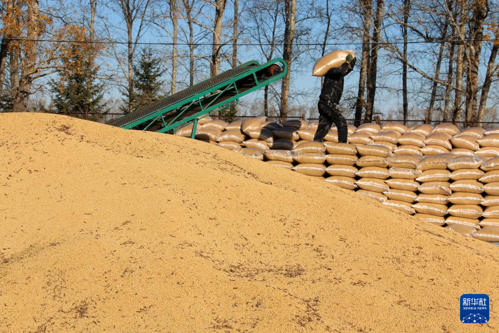 10月3日,在北大荒集团黑龙江五大连池农场有限公司第一作业区粮食晾晒场,种植户在堆放大豆。新华社发(陆文祥摄)