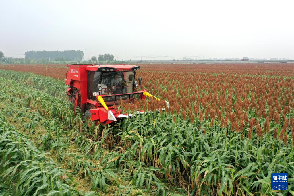 10月7日,在河北省邢台市南和区和阳镇东关村,农民驾驶收割机收获高粱(无人机照片)。新华社记者 王晓 摄