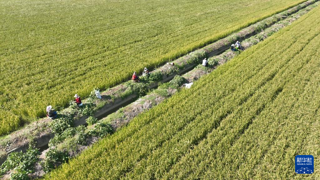10月4日,江苏省淮安市洪泽区农民在采摘毛豆(无人机照片)。新华社发(万震摄)