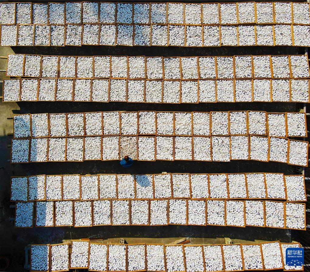 10月4日,在安徽省安庆市岳西县响肠镇千佛塔村,村民在晒茯苓(无人机照片)。新华社发(吴均奇摄)