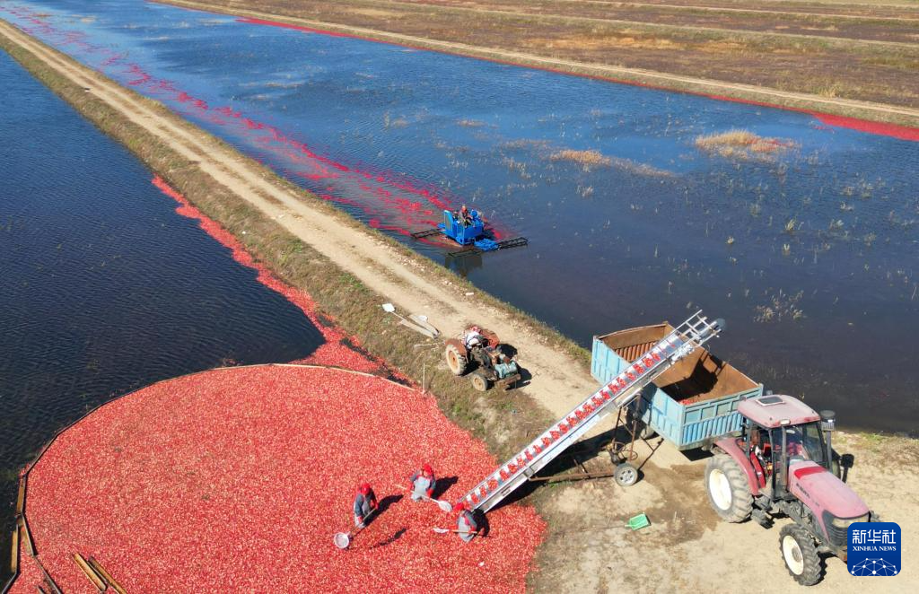 10月4日,在黑龙江省抚远市蔓越莓种植基地,工人在水中采收蔓越莓(无人机照片)。新华社发(李拥军摄)