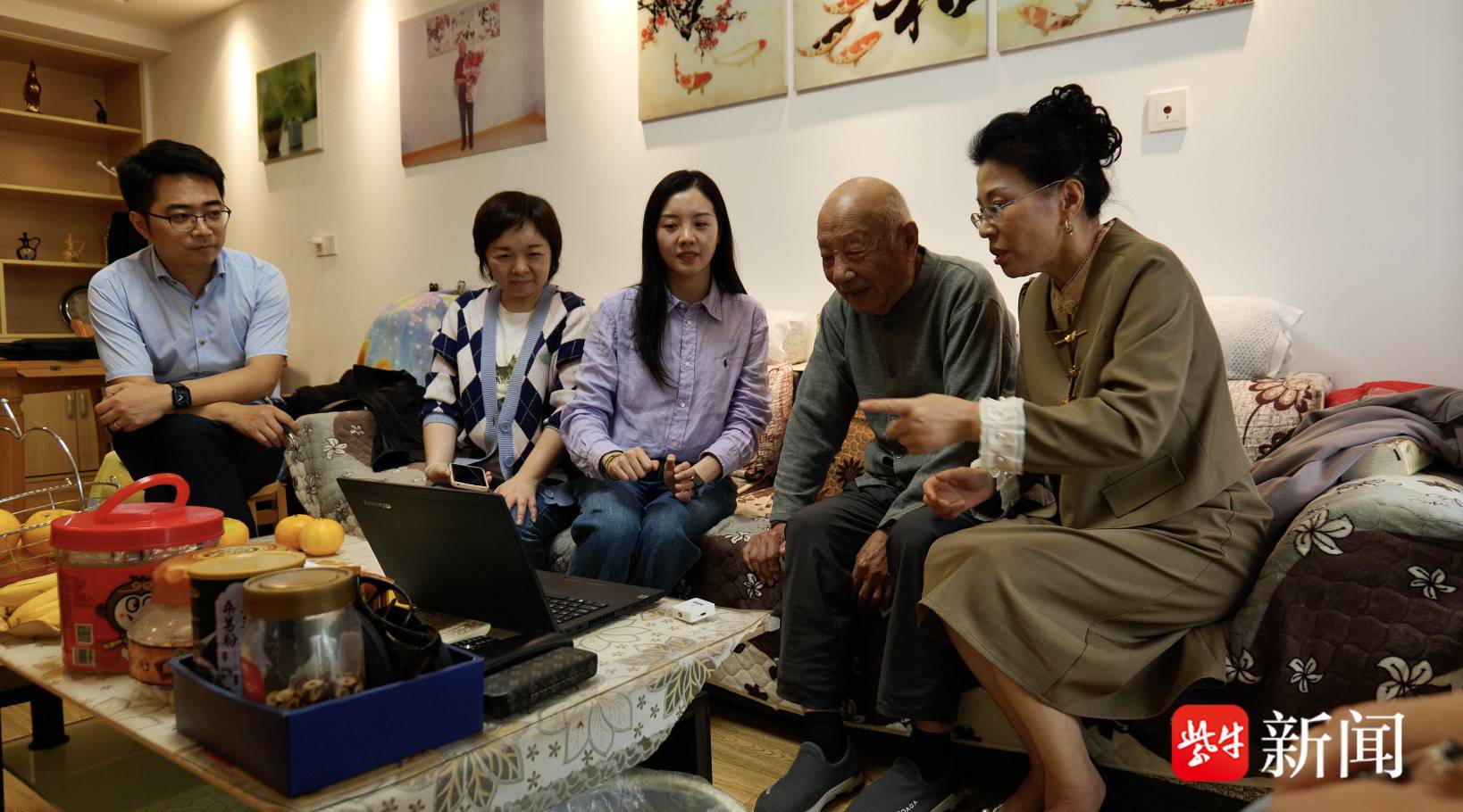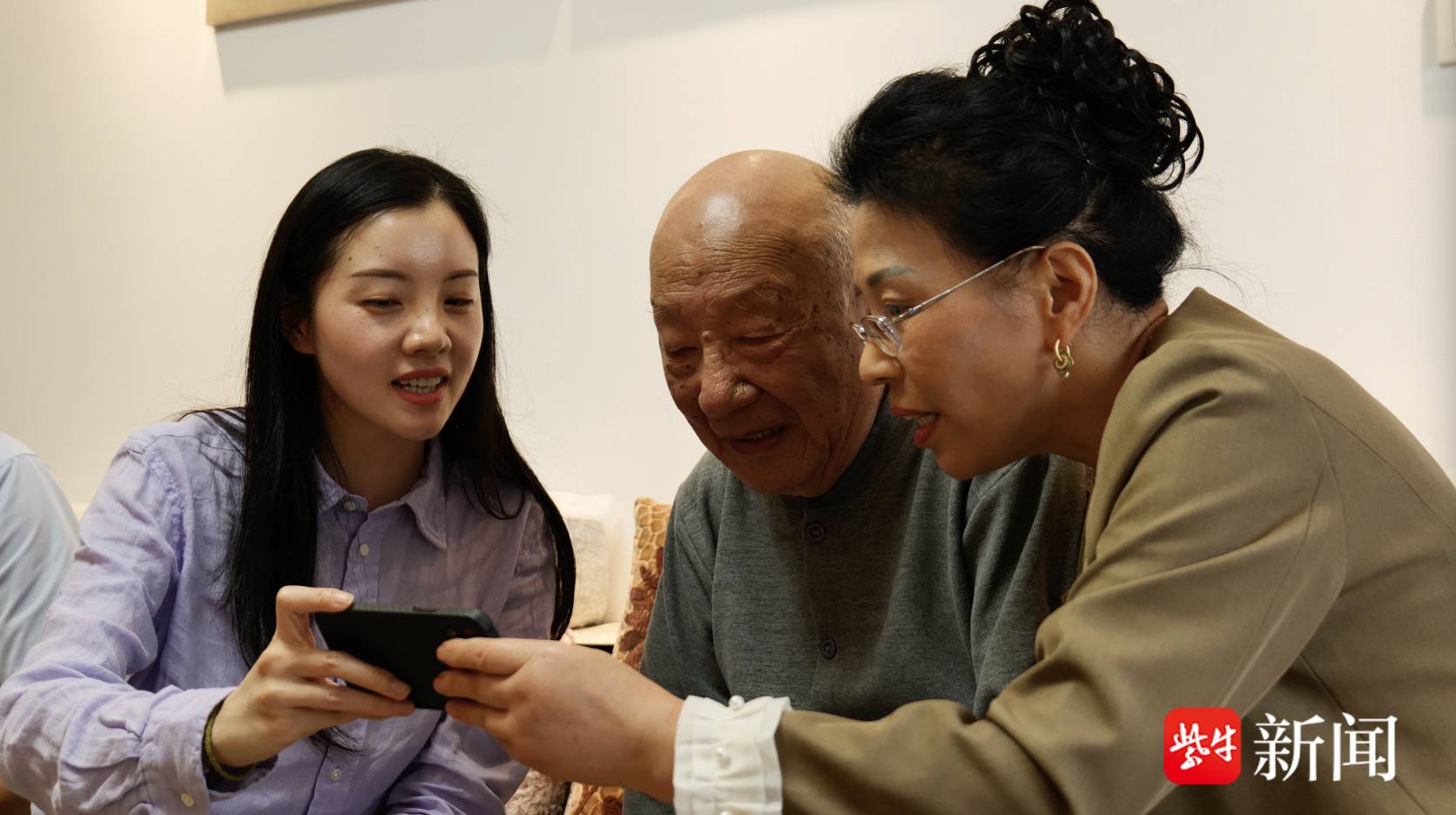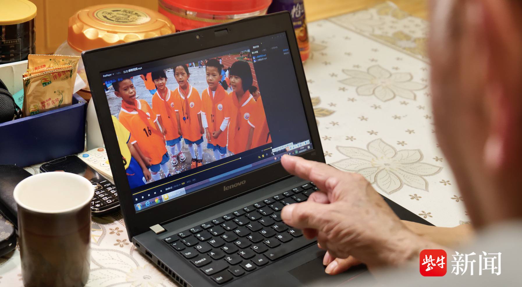 1800公里之外,96岁镇江爷爷杨文明作为新球服捐赠人,看着视频,激动得热泪盈眶。听着千里之外的童声稚语,老人不停地对着视频说:“好、好、好.....”