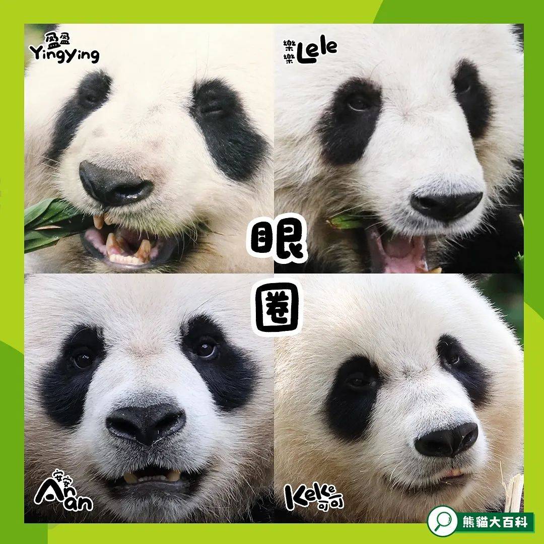 大熊猫“盈盈”的“黑眼圈”是“8字”型的,“乐乐”的“黑眼圈”比较圆,“安安”的“黑眼圈”像葫芦,“可可”的“黑眼圈”则是类似肥皂的形状。