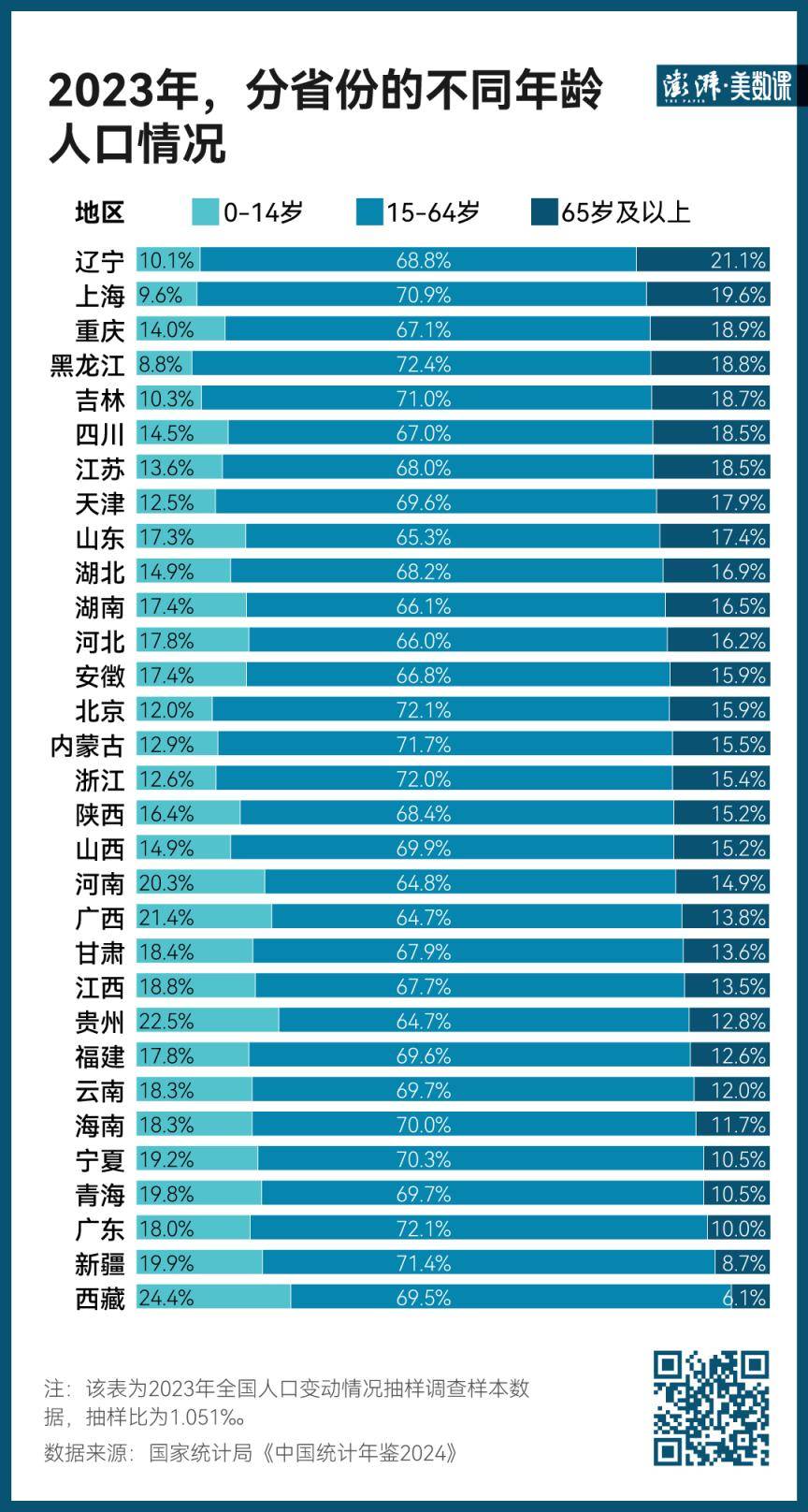 具体到各省份的抽样数据,2023年山东的65岁及以上老年人数量是全国最多的,但如果换算成占比,辽宁的65岁及以上老年人占比才是最高的。