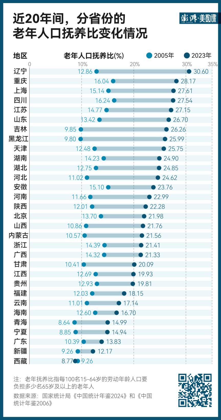 2023年,辽宁的老年人口抚养比达到30.6%。这意味着,每3.27名劳动年龄人口就要负担1名老年人。