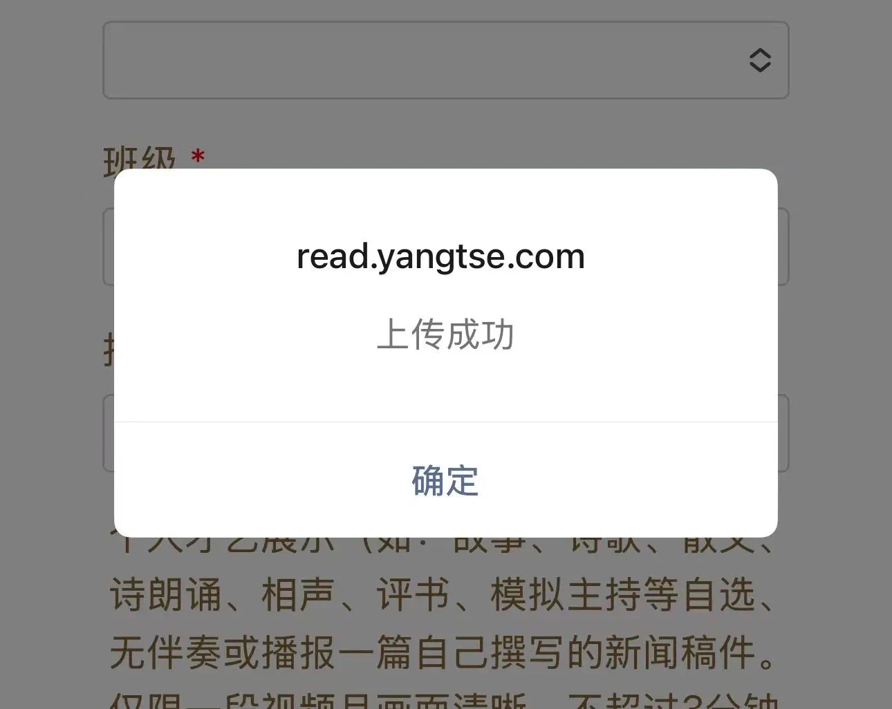 视频上传后,将提示“上传成功”(如未出现提示请耐心等待),点击“确定”后再进行下一步操作。