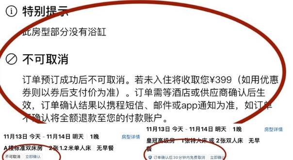 “以前只要提前申请,酒店预订就可以免费取消,但现在发现并非都是这样。”陈女士告诉记者,外地朋友说11月底要来无锡周边玩几天,她就为朋友一家预订了一晚太湖边的某星级酒店,价格在700元左右,没想到朋友行程临时有变化,只能取消预订。“我11月12日预订的房间,入住时间是11月25日,当时没有注意看,因为在我的概念中,只要在入住前退房,应该都可以的。”记者查询后发现,这家酒店确实标有预订后“不可取消”的字样,但陈女士觉得,“这种‘不可取消’最让人无语,哪怕距离入住还有很长时间,退订也可能被扣全部房费。这样无条件让消费者承担全部责任不合理。”