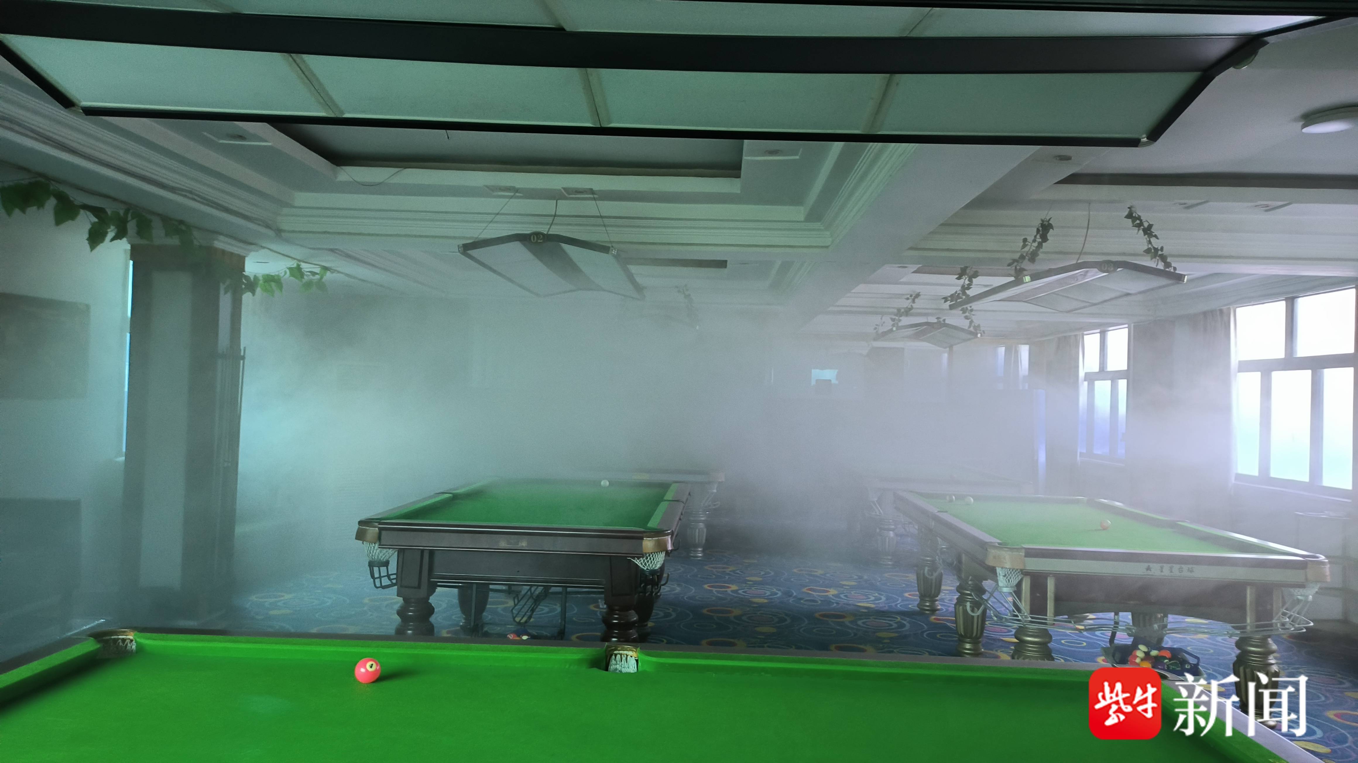 演练场景设置为:楼内台球厅关门后,顾客遗落在角落的烟头引燃地毯,火势迅速蔓延,点燃窗帘、纸箱等易燃物。