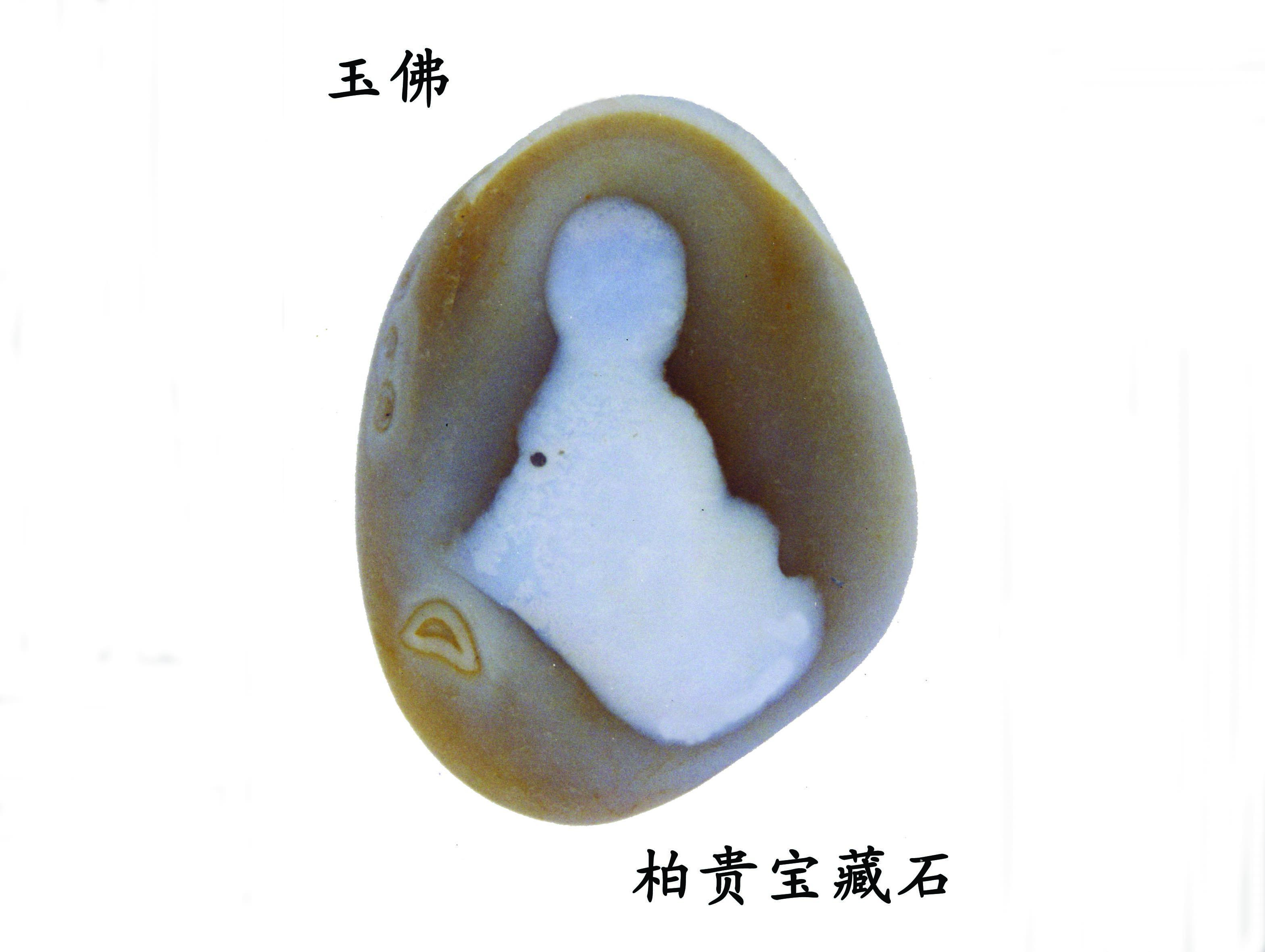 拜佛后我们来到中山陵对面的雨花石市场,有一位摊主瞧着我说:“前几天我在中央二套的电视节目中,看到你,介绍你觅石的经历,你姓柏,是吧?”我点头称是。他热情地说:“摊头没什么好贷,我另给您看一些石头,还请您帮忙起起名。”说着他从柜子里找出几枚石头给我看,我拿在手上仔细端详,被一枚黄白相间的美石吸引,石上呈现出一尊玉佛画面(见下图)。玉佛侧身打坐,石质细润,比例适中,布局合理,居中的佛像犹如白玉,玉佛背上还呈现出一个小圆眼,就像系红绳之处,惟妙惟肖,妙不可言。摊主介绍说:“这是一枚‘雪人’,寓意下雪后堆起的雪人模样,柏老师若是喜欢,二十元钱拿去。”我听此价暗喜,立即付钱成交。请回了此宝,兴致大发,随后将他其它几枚石头起了名,手握“玉佛”喜气洋洋的回了家。