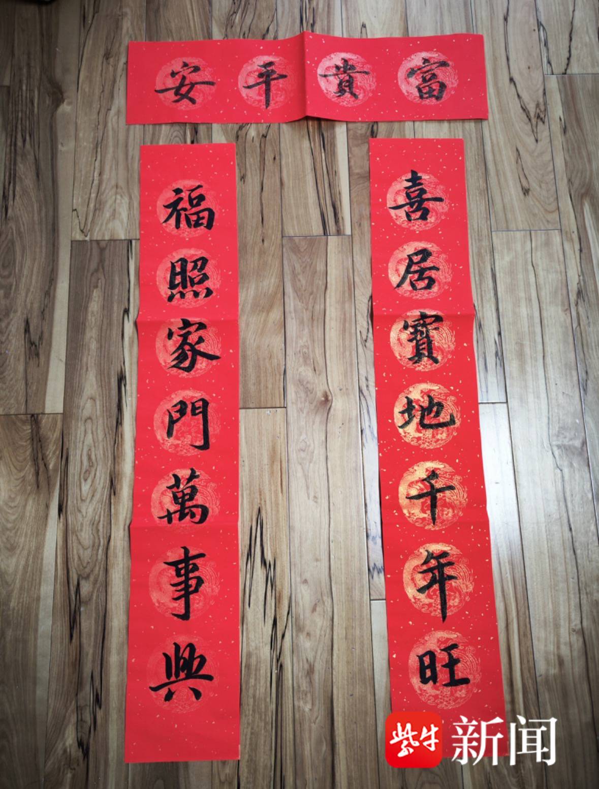 11月28日中午,扬子晚报/紫牛新闻记者来到苏州市草桥中学校,与两位“小书法家”进行了面对面交流。七年前,张文心开始学习书法,每一次进步都让她获得满满的成就感。这次比赛中,她书写的“喜居宝地千年旺,福照家门万事兴”笔划流畅,字体端庄秀丽,尽显文字之美。