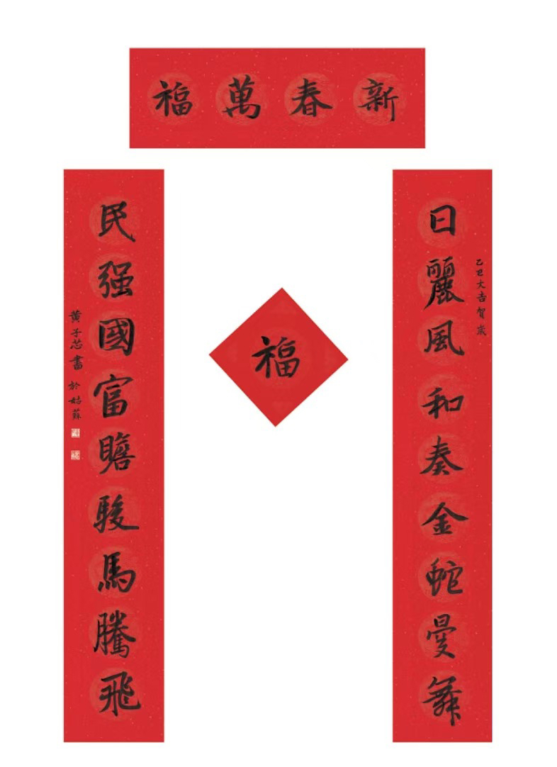 七年级(7)班的黄子芯书写的春联“日丽风和喜奏金蛇曼舞,民强国富远瞻骏马腾飞”,在众多投稿作品中崭露头角,字里行间洋溢着对新春的祝福与对祖国富强的美好期许。