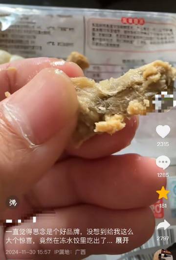 近日,广西南宁网友发视频称,在思念速冻水饺中吃出了疑似“烟头”的异物。对此,12月2日上午,思念水饺官方客服回应,记录信息后,将有专人处理。南宁市市场监督管理局工作人员表示,对此正在处置核查,具体购买信息需进一步了解核实,“是否为烟头看起来也不是很明显,要先找到购买地进行线下核查”,核查后再联系厂家,目前暂未联系到这位网友,正通过相关部门查询。该工作人员表示,若情况属实,则属于生产环节问题,查实后才能由相关单位进行处理。上述网友表示,已与品牌方和经销商取得联系,自己“确定是烟头”,将与经销商一起去市监局,“等经销商进一步答复”。