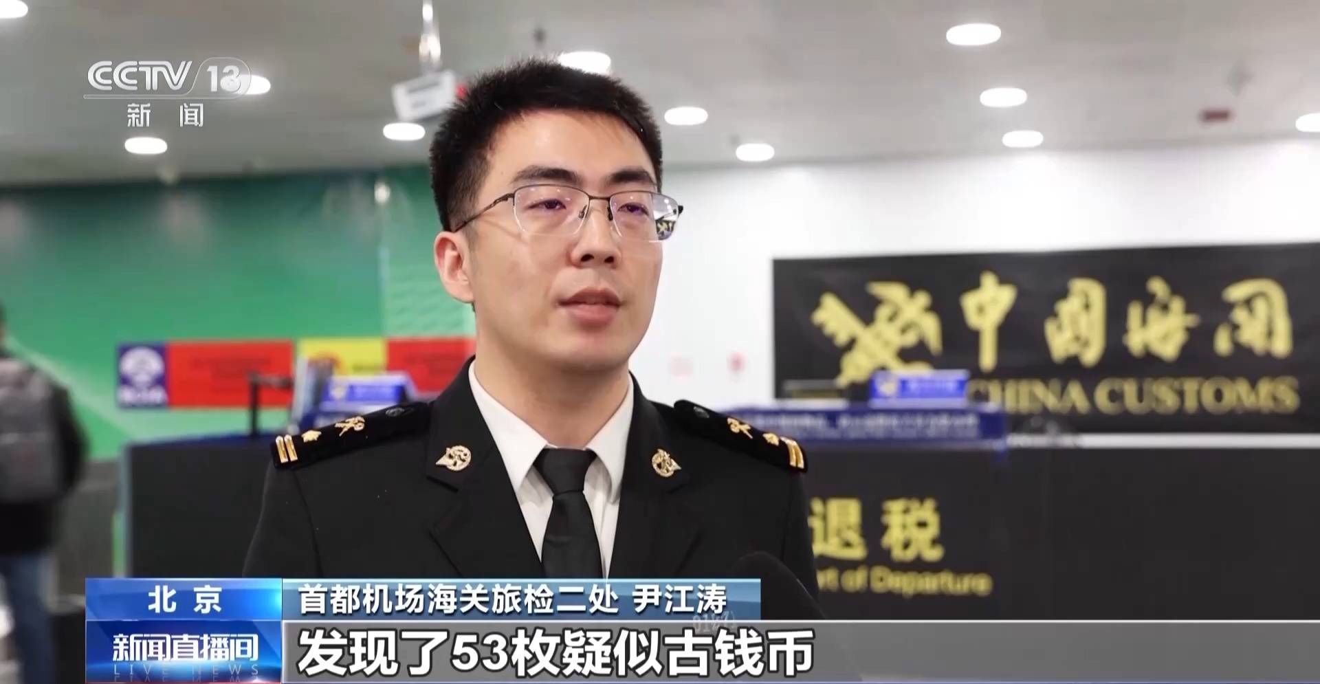 首都机场海关旅检二处 尹江涛:经查验,在该名旅客的行李物品中发现了53枚疑似古钱币。后经国家文物局鉴定,为宋代铜钱,属于国家禁止出境文物。