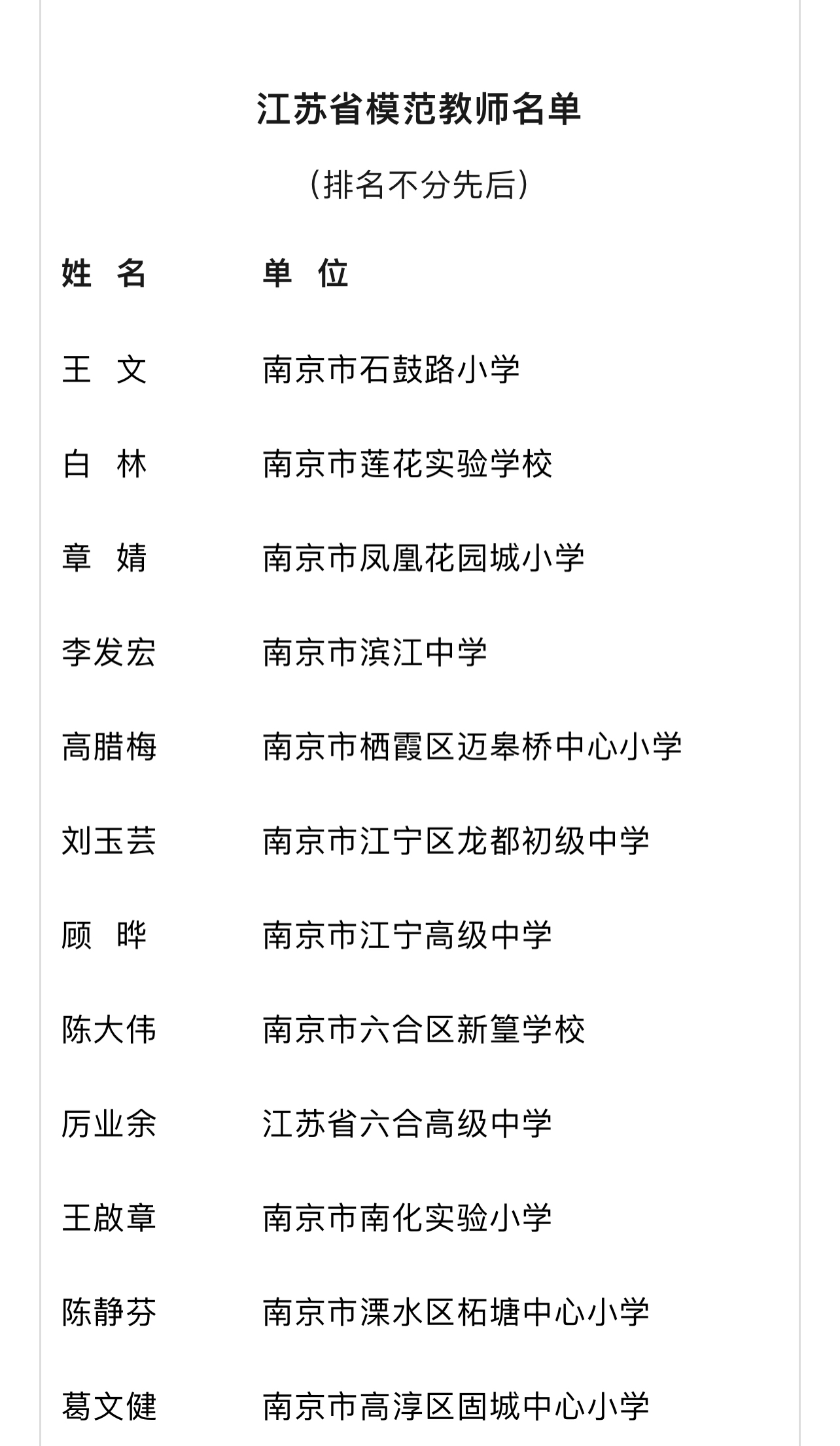近年来,全省广大教师认真落实立德树人根本任务,积极投身教育强国建设,涌现出一批先进典型。为进一步增强广大教师的荣誉感和责任感,弘扬尊师重教的社会风尚,激励广大教师自信自强、踔厉奋发,经过层层推荐、审核和公示等程序,江苏省教育厅授予王文等150名同志“江苏省模范教师”称号。希望全省广大教师全面贯彻落实党的教育方针,落实立德树人根本任务,弘扬践行教育家精神,以德立身、以德立学、以德施教,争做学生为学、为事、为人的示范,努力为推进教育现代化、建设教育强省、办好人民满意的教育作出更大贡献。