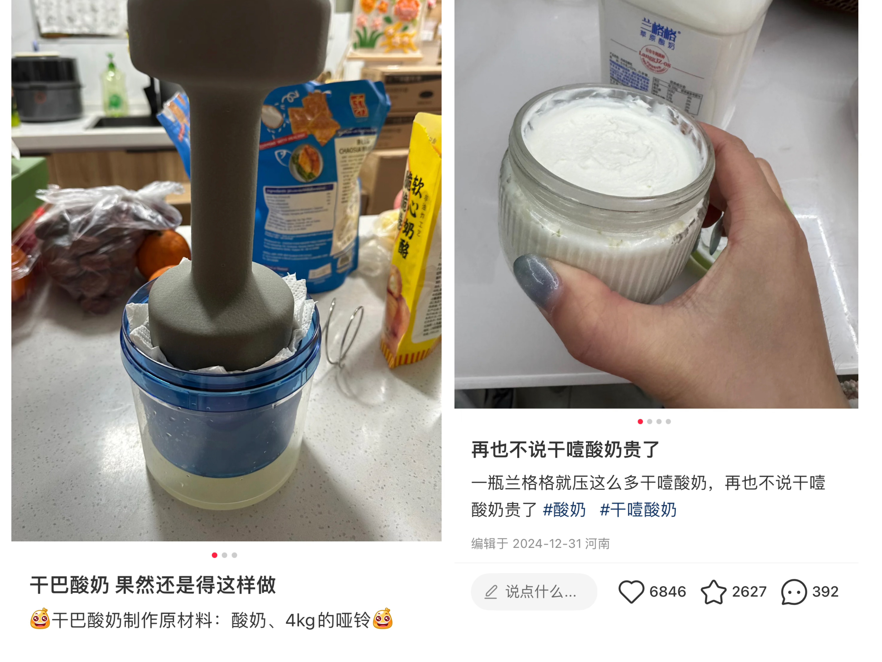 一款成功的自制干噎酸奶要“像砖块一样”,有网友调侃,“吃这一口脖子能伸二里地”“常吃能锻炼出八块腹肌”。记者注意到,在众多自制攻略中,方法并不复杂,最重要的步骤就是过滤乳清:首先将纱布放在过滤器上,随即倒入酸奶,并狠狠压住放在冰箱静置!有人为了酸奶达到极致压缩的效果,直接上了4kg的哑铃!