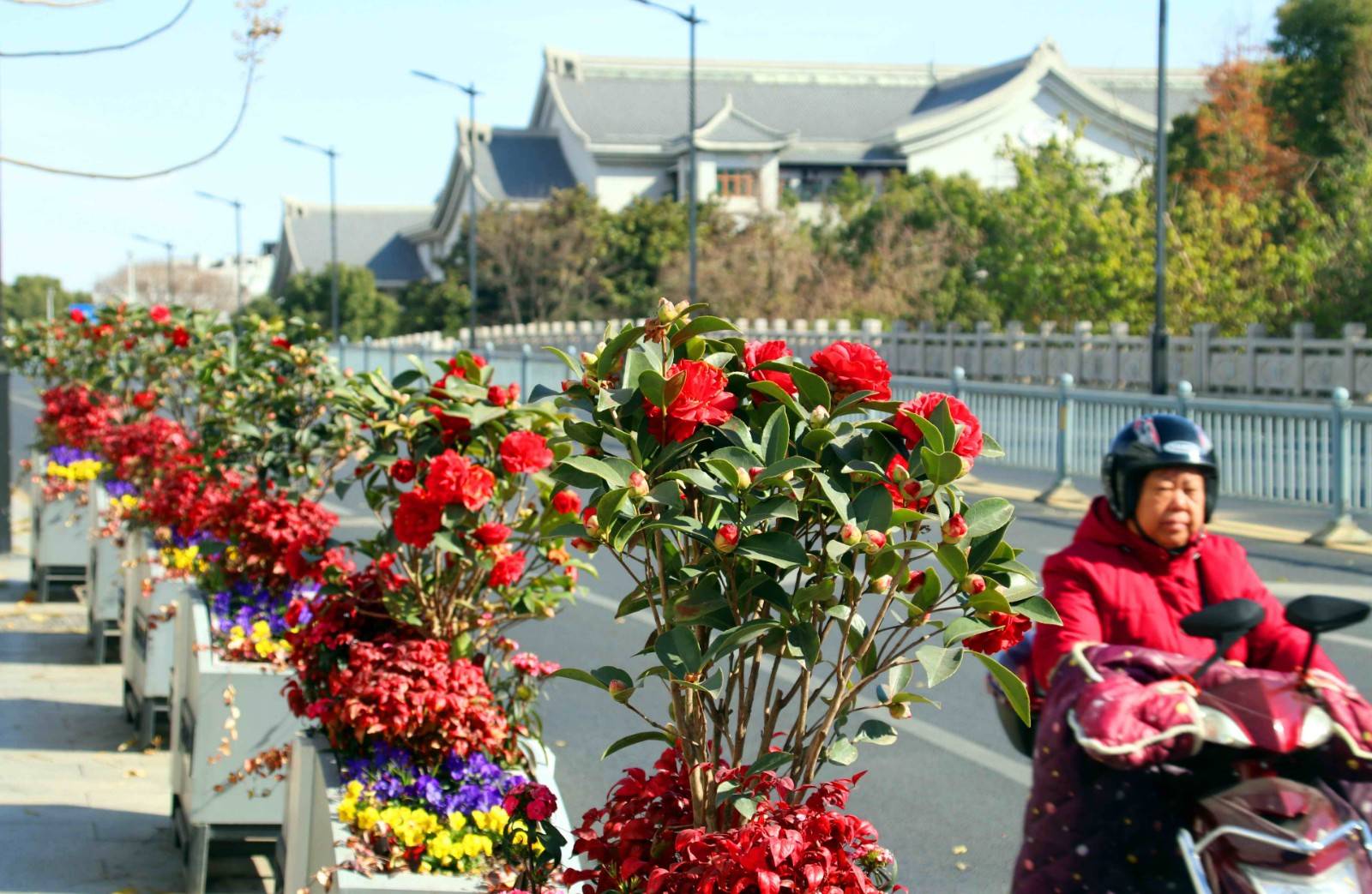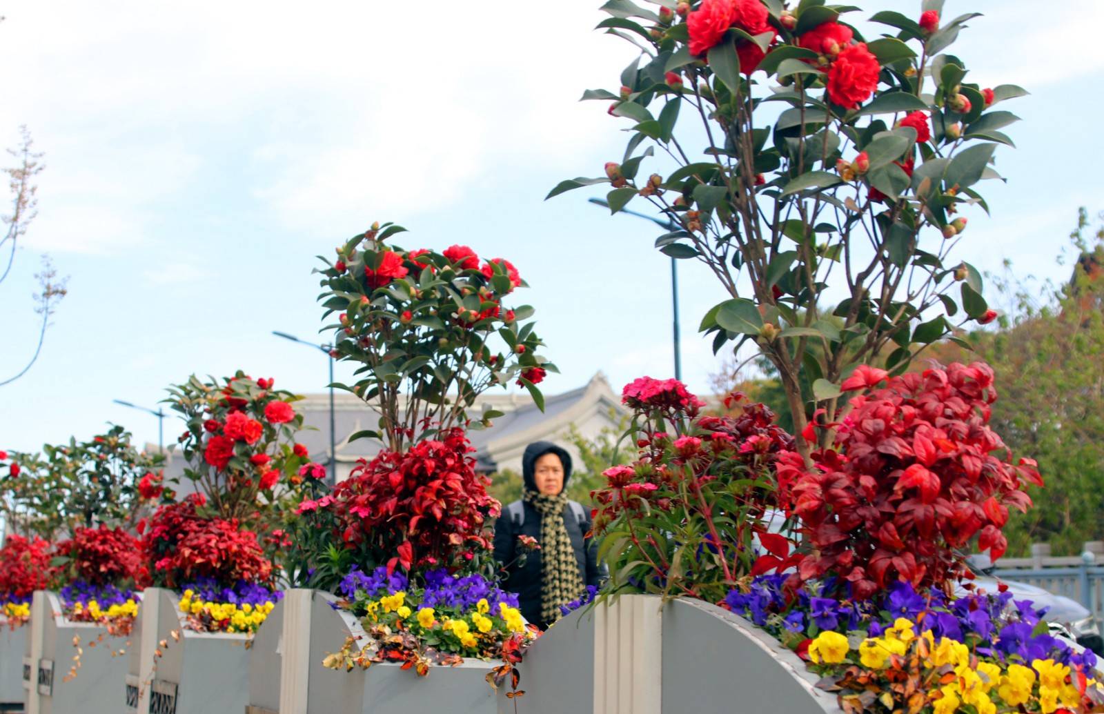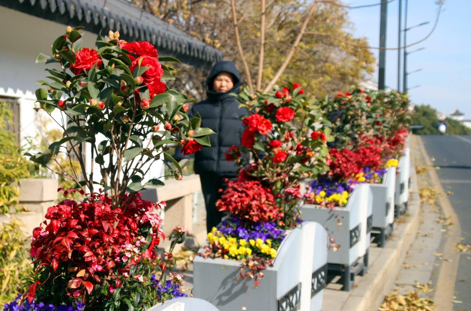 2025年1月9日,市民从江苏省苏州市景德路上盛开的山茶花旁经过。新春佳节临近,江苏省苏州市区景德路上摆放的山茶花竞相绽放,营造出了浓郁的喜庆气氛,令人赏心悦目。王建康
