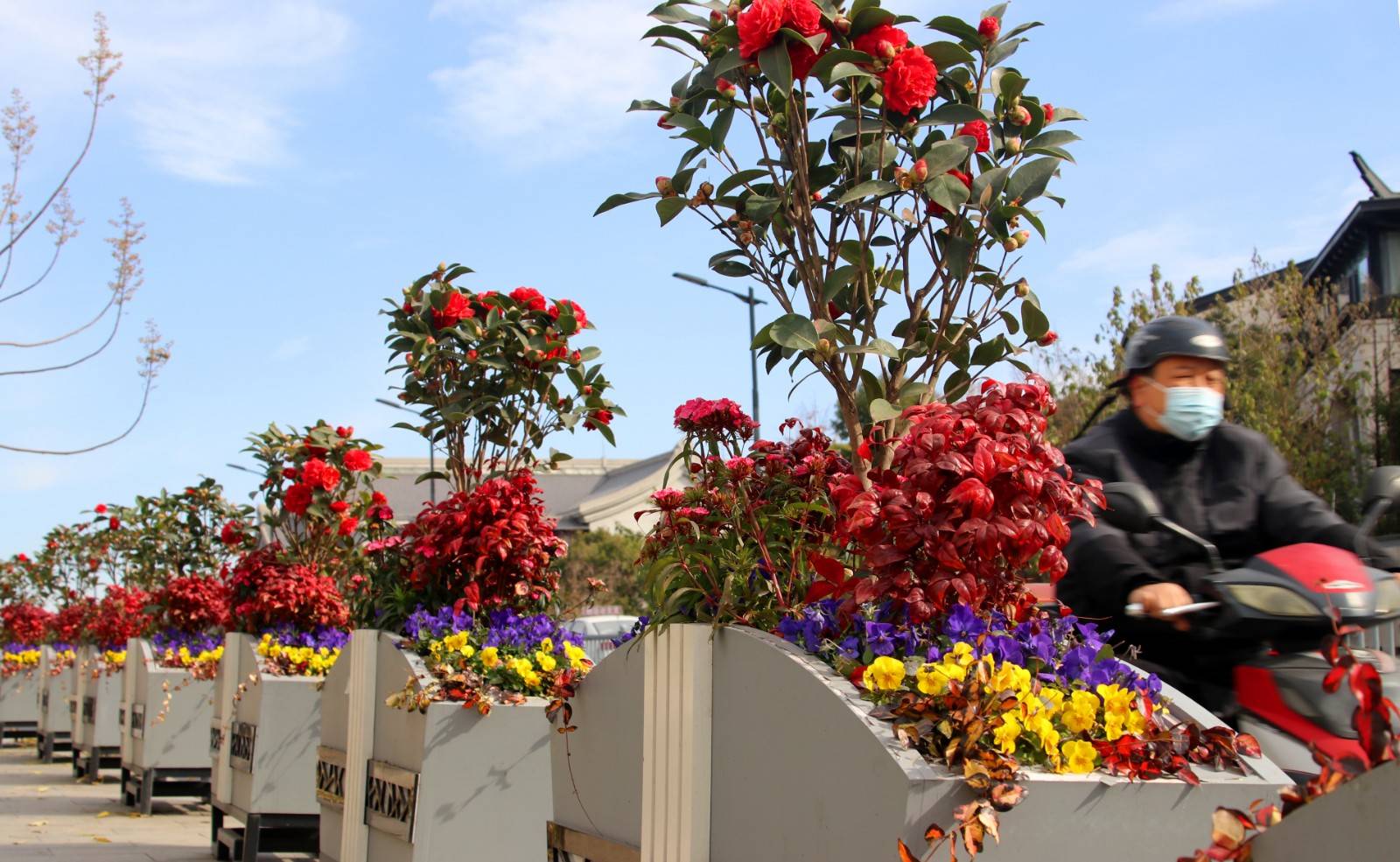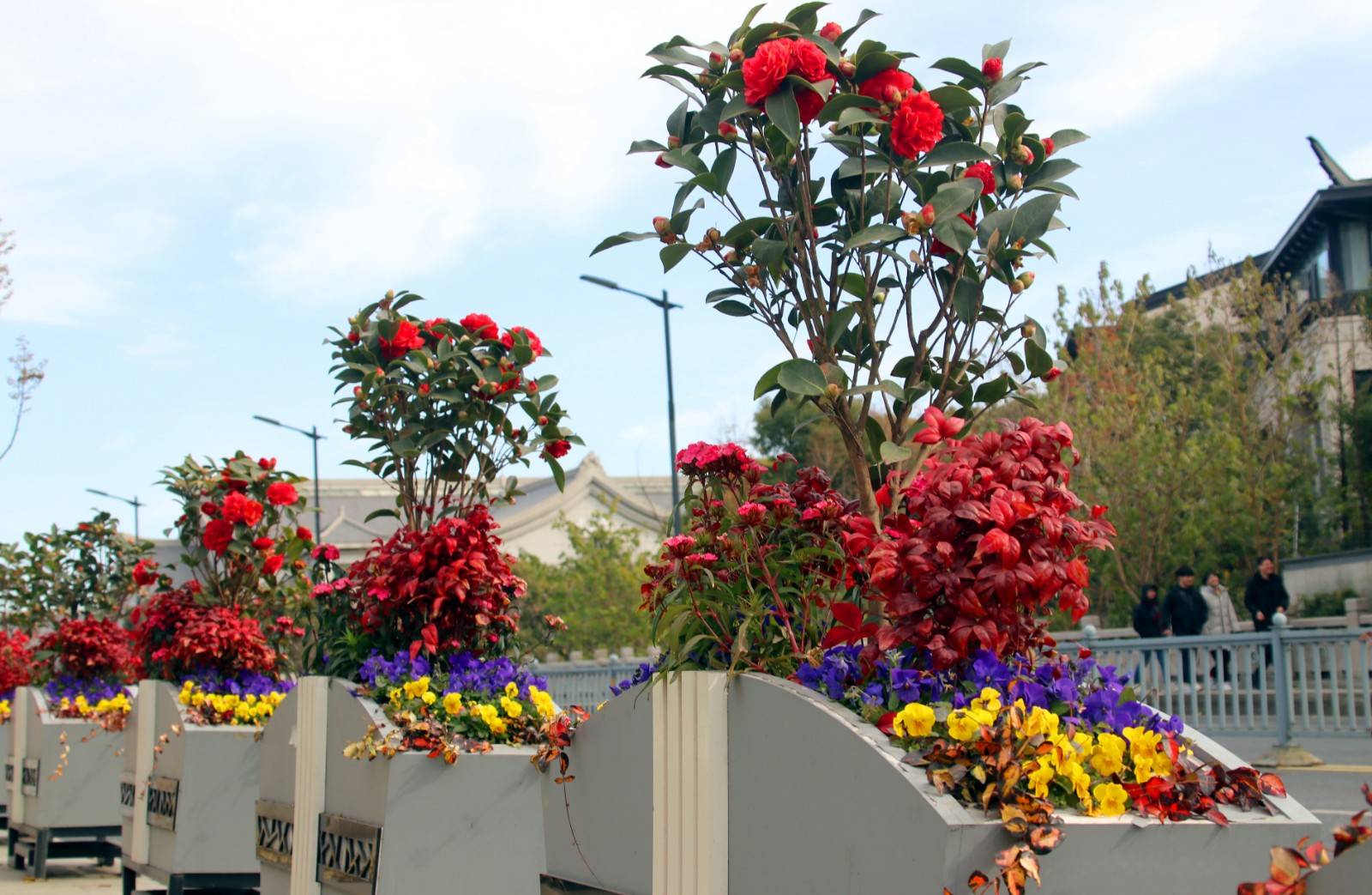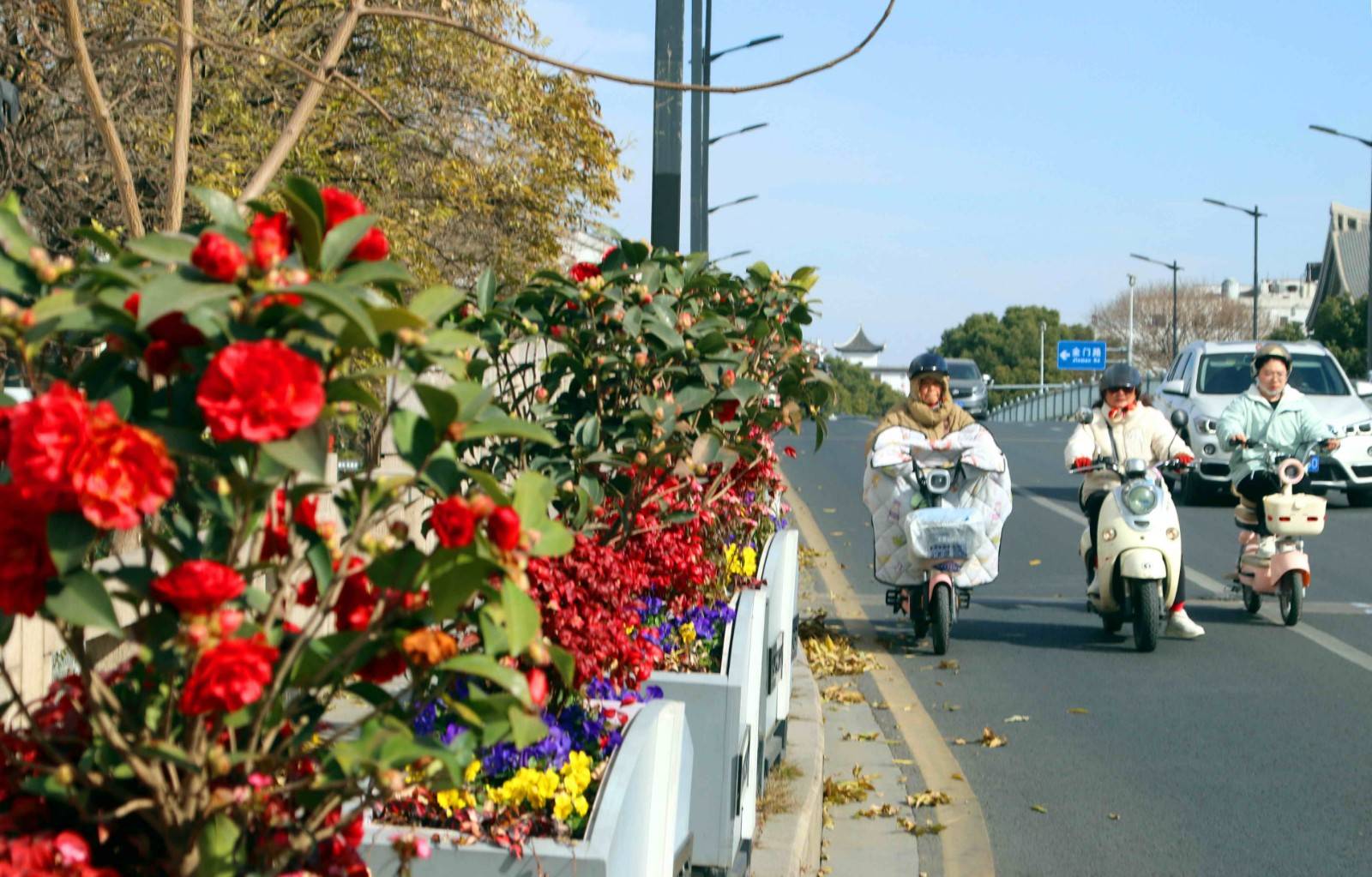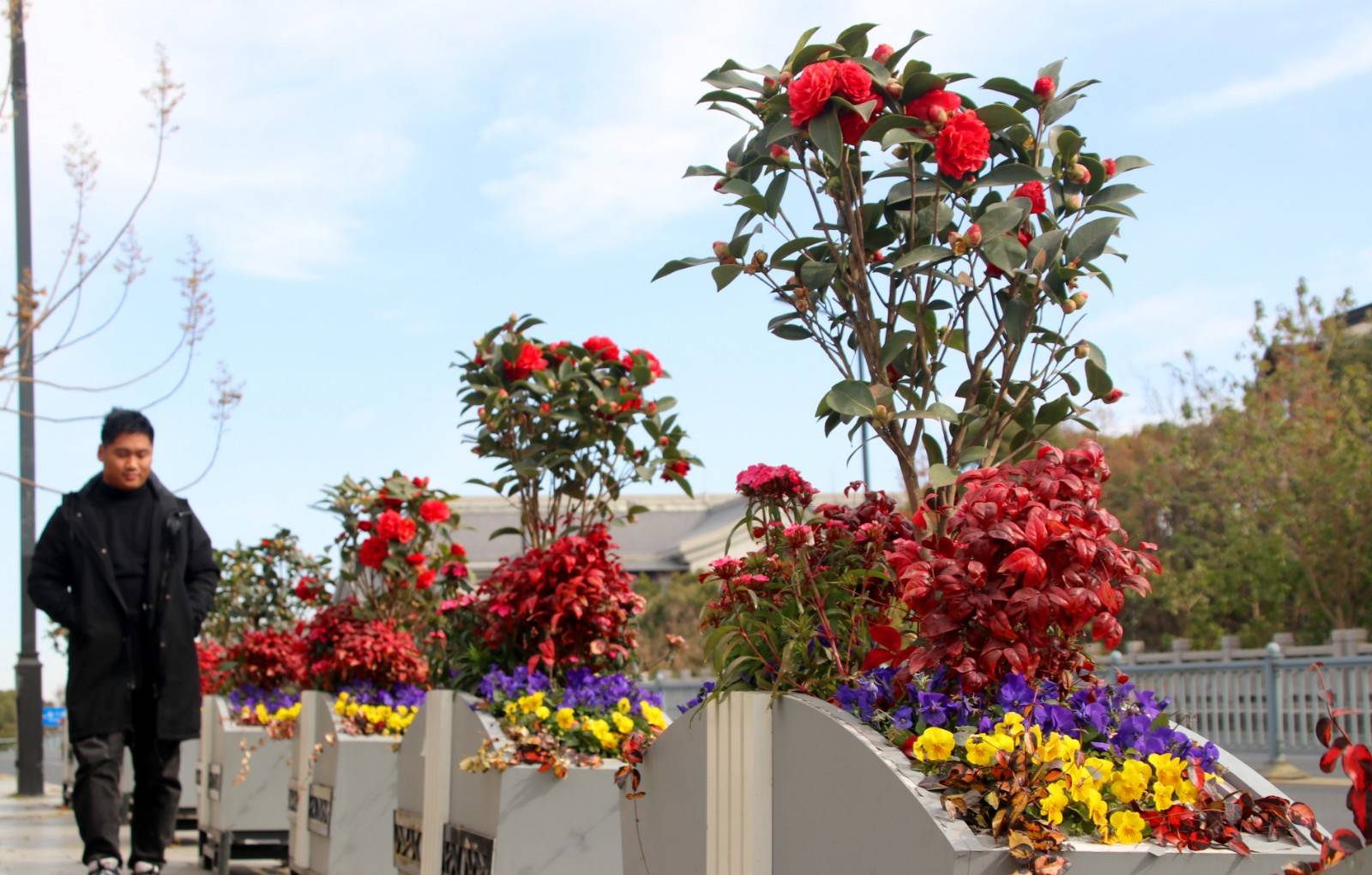 2025年1月9日,市民从江苏省苏州市景德路上盛开的山茶花旁经过。新春佳节临近,江苏省苏州市区景德路上摆放的山茶花竞相绽放,营造出了浓郁的喜庆气氛,令人赏心悦目。王建康