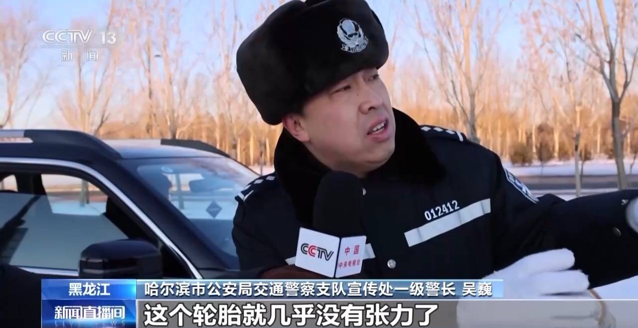 哈尔滨市公安局交通警察支队宣传处一级警长 吴巍:冬季轮胎的胎花比较大,而且冬季轮胎在-24℃以上的时候,依然具有张力。相对而言,四季轮胎在-7℃左右的时候,这个轮胎就几乎没有张力了,因此它的摩擦系数相对较小。我们建议南方的游客到哈尔滨选择自驾游,或者是租车出行的时候,尽量选择冬季轮胎车辆。