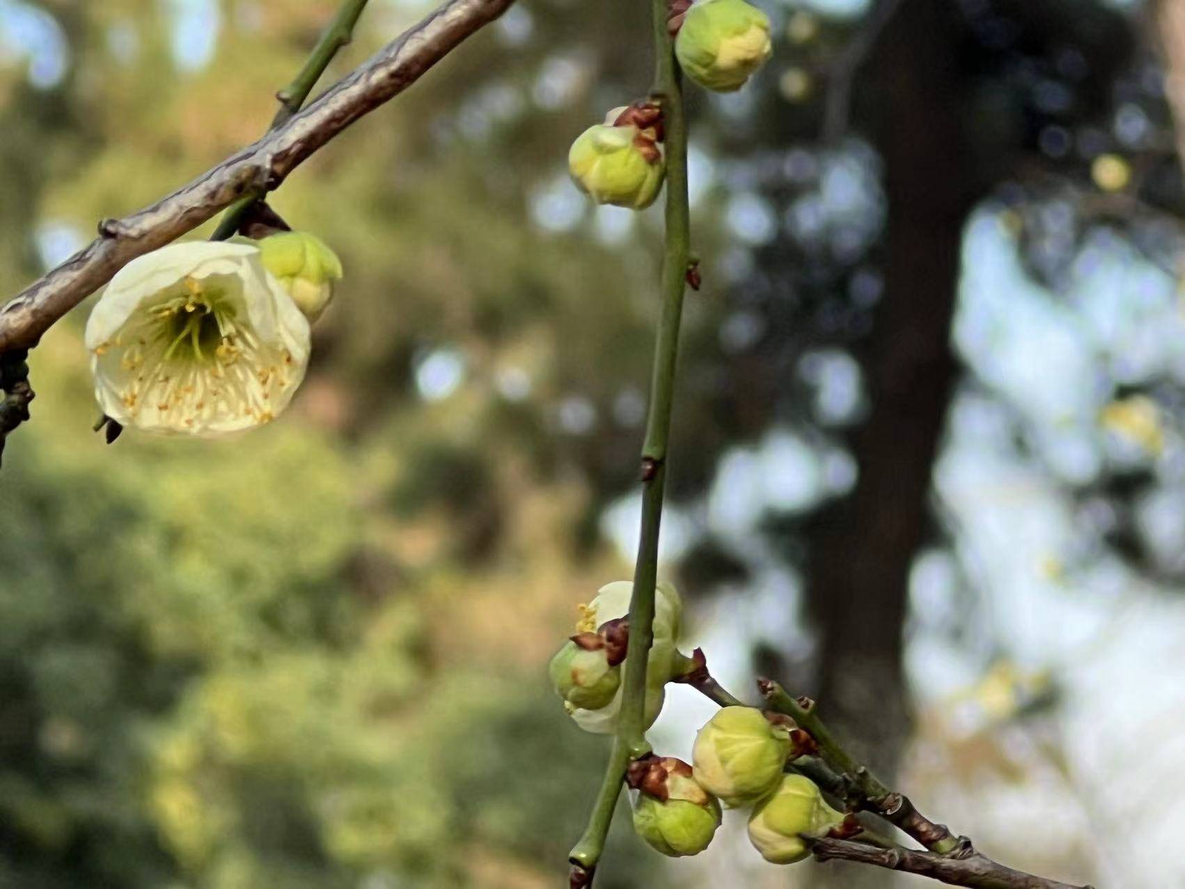 莫愁湖是一个大花园,一年四季花事不断。新春刚到,金色的蜡梅还没有卸妆,风情万种的红梅就已经急不可待地登台了。华严庵前,一大片梅林,是红梅、白梅、绿梅共同的舞台。满树娇蕊绽放在春阳下,星星点点煞是好看,夺人眼球。微风拂处,暗香浮动,让人沉醉。不时有摄影爱好者流连树下,用相机或手机,捕捉梅花仙子的娇艳的容颜。