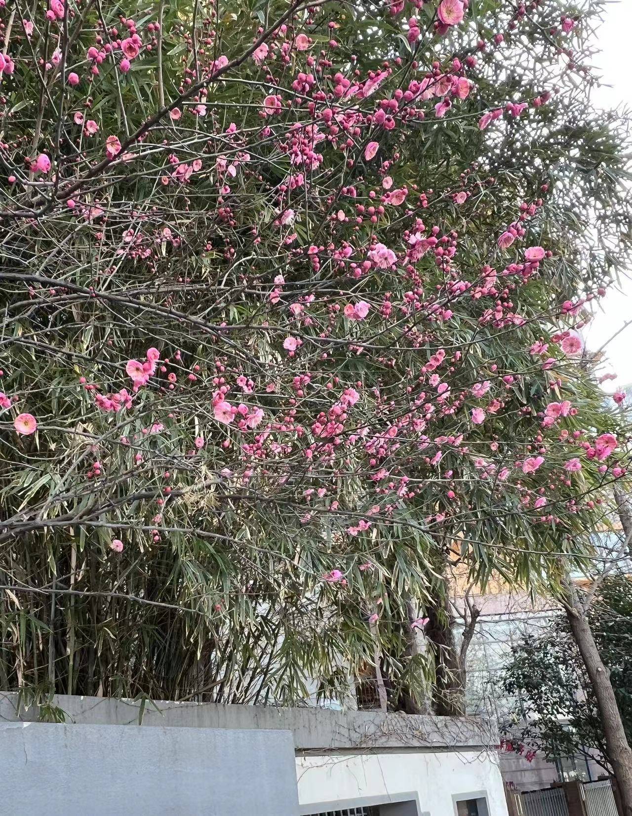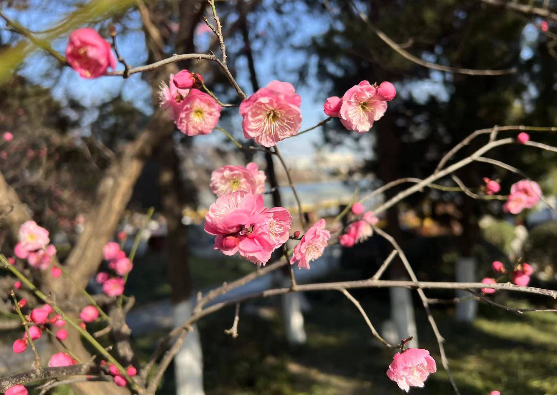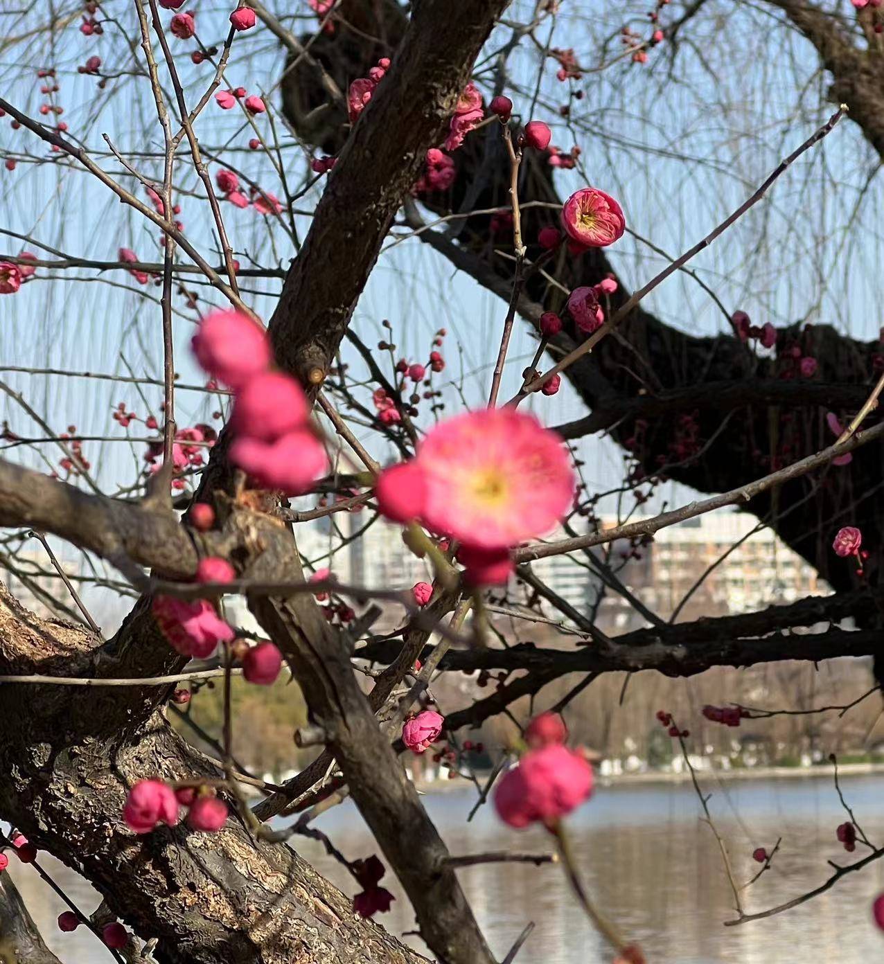湖畔邹鲁碑亭前,绿道围墙里,也有梅树花开满枝头,引人驻足。