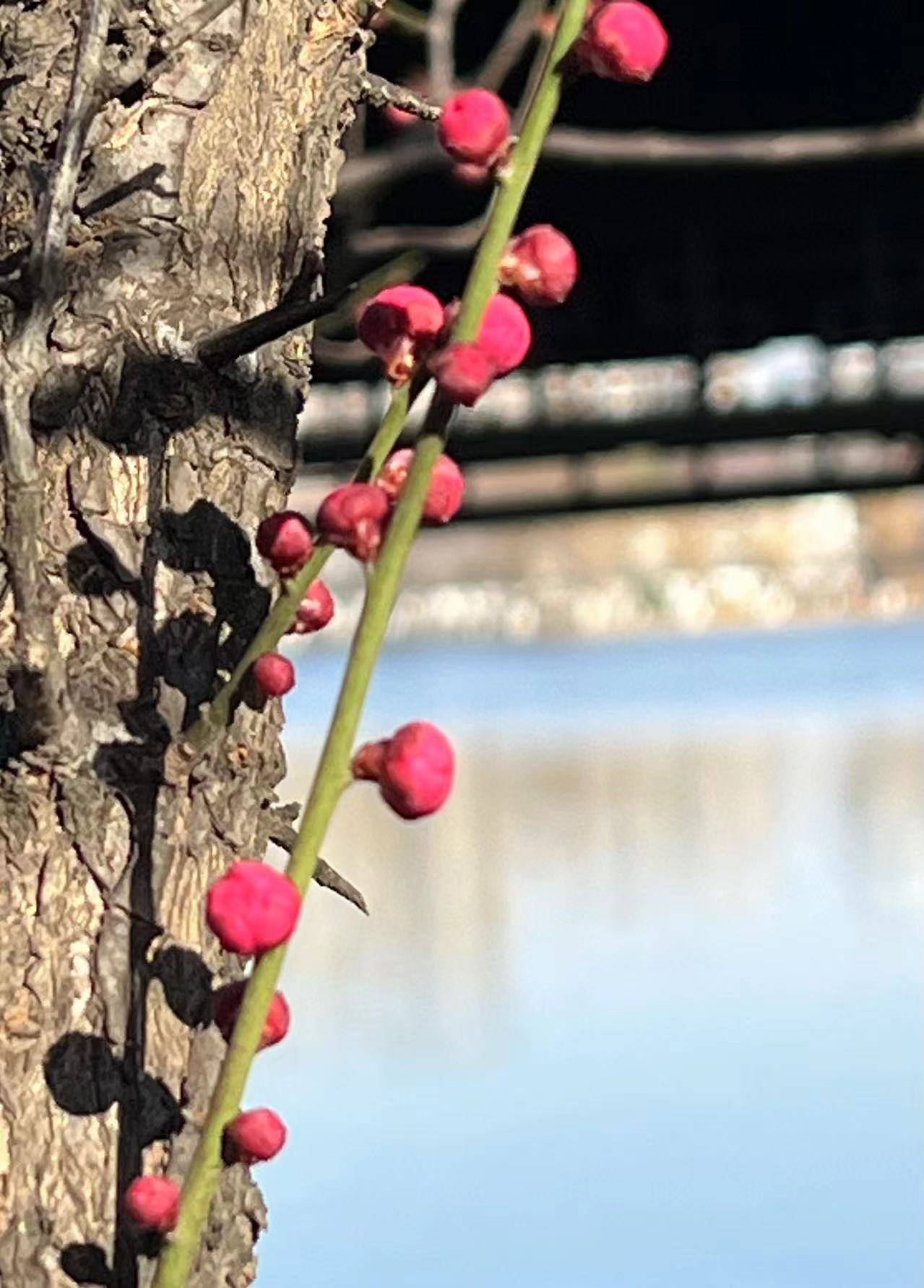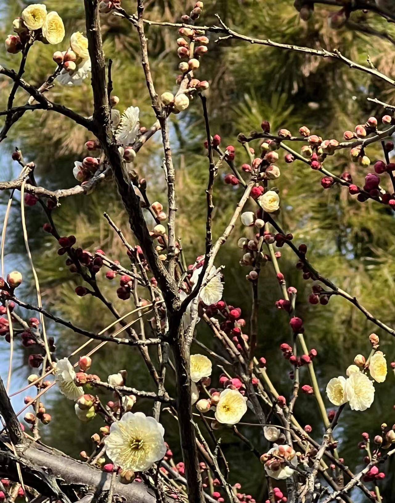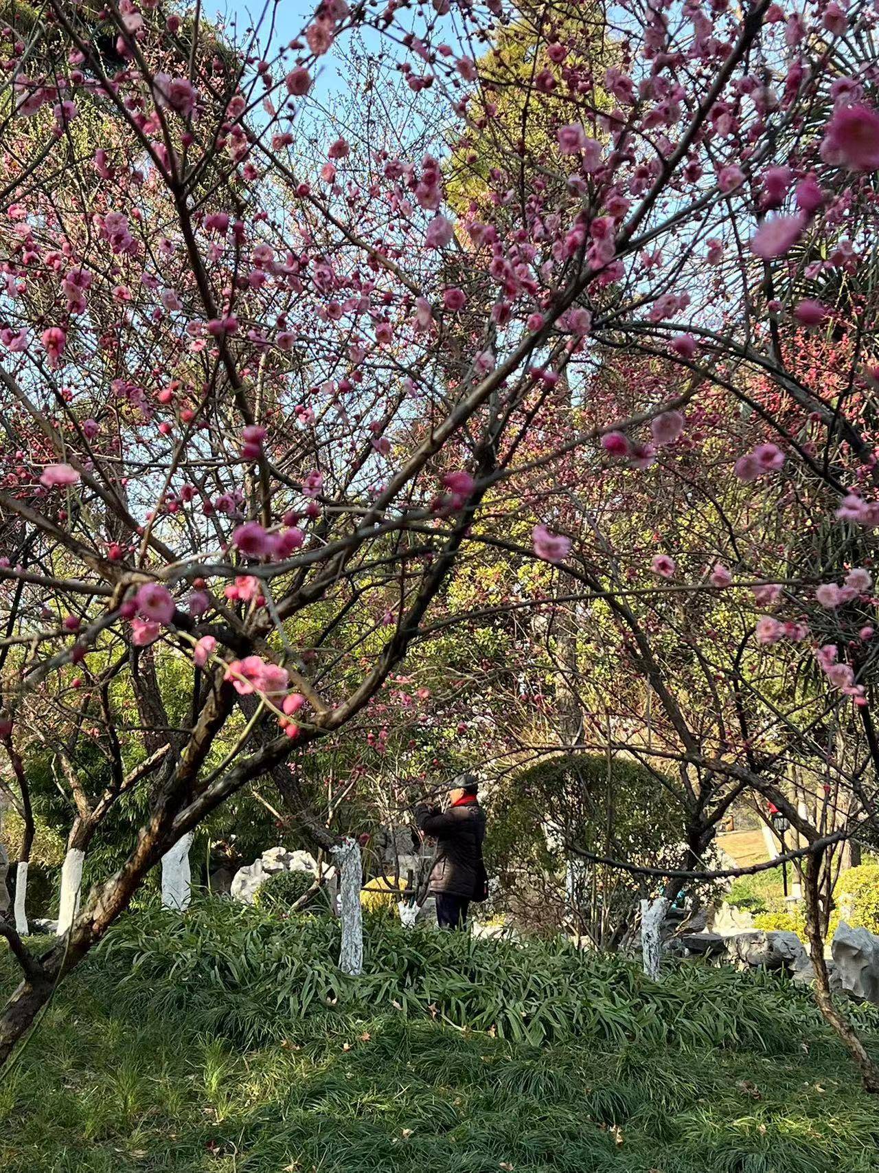 湖畔邹鲁碑亭前,绿道围墙里,也有梅树花开满枝头,引人驻足。