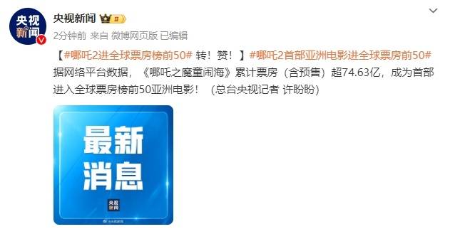 据网络平台数据,《哪吒之魔童闹海》累计票房(含预售)超74.63亿,成为首部进入全球票房榜前50亚洲电影!(总台央视记者 许盼盼)