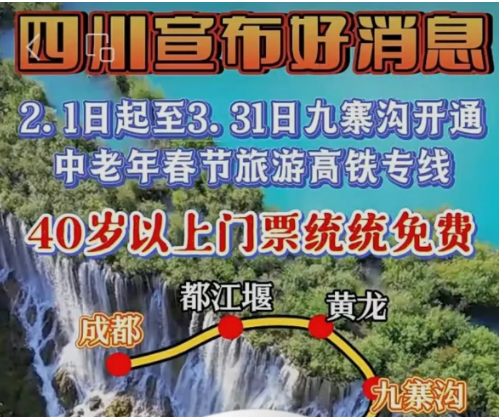 扬子晚报网2月10日讯(记者 郭一鹏) 带着春节的“余温”,眼下,国内旅游市场依旧热度不减,而这段时间,一则关于九寨沟景区40岁以上免门票的信息在网上传开。
