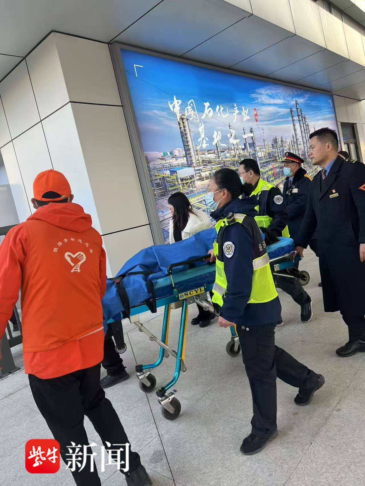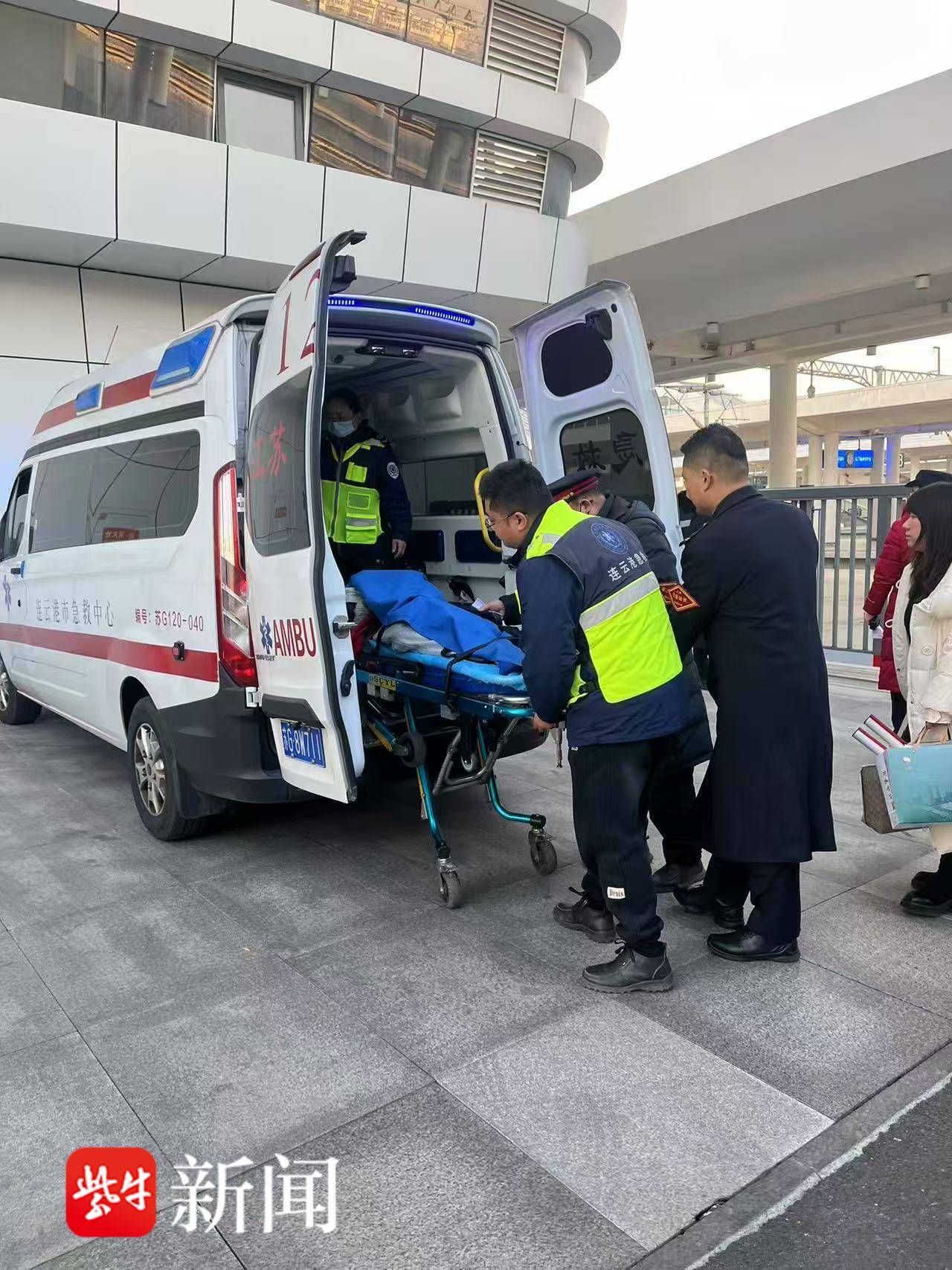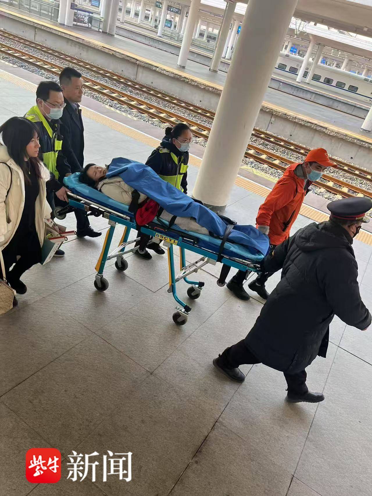 当天16时03分许,D2145次连云港站9台停妥,客运员徐新刚、孙和平立即携带担架,将旅客王女士抬上,转运至120救护车送往医院救治。