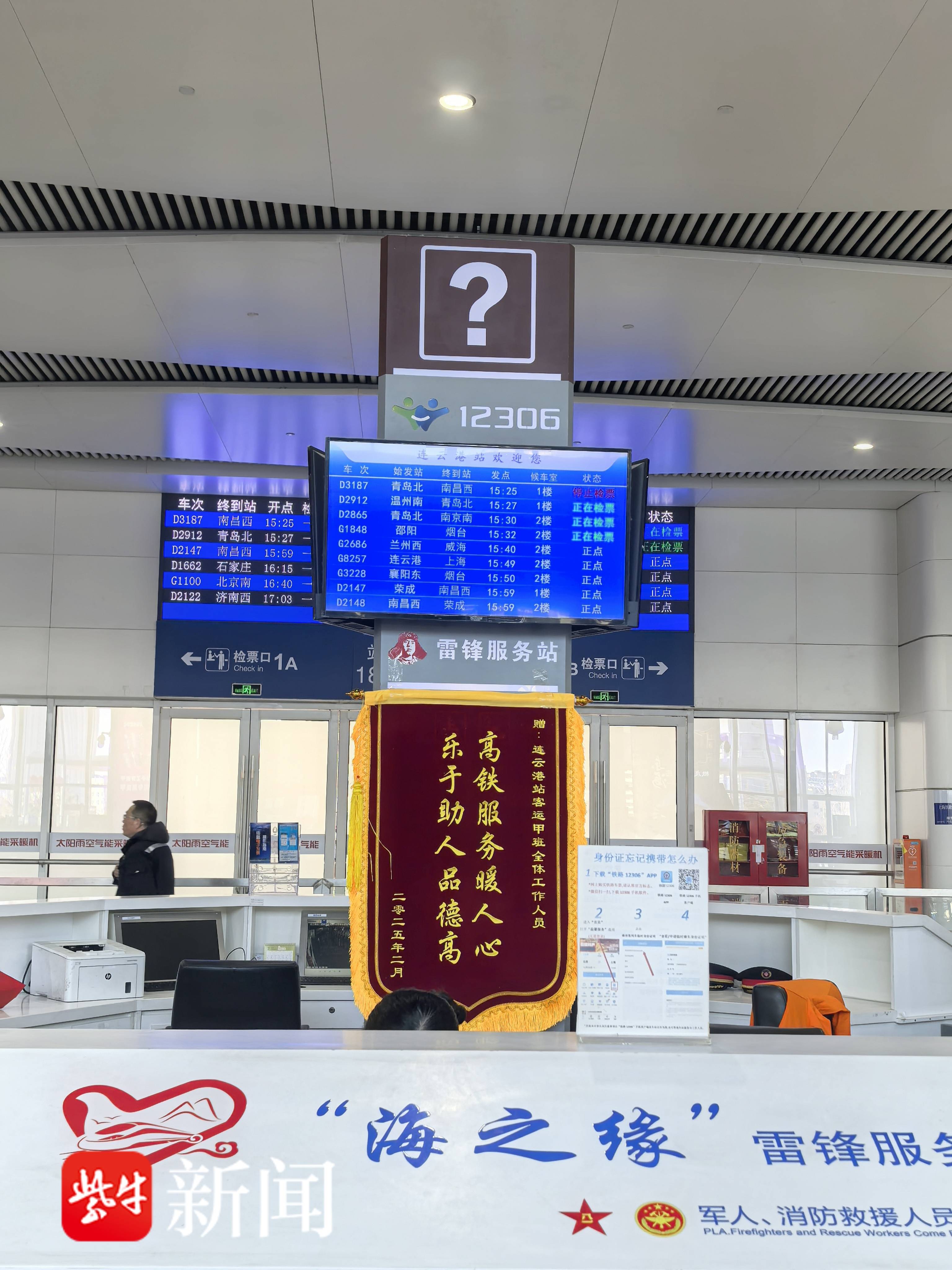 2月13日上午,铁路连云港站客运甲班班长许祥永收到家住浙江桐乡市的市民王女士寄来的一面“高铁服务暖人心、乐于助人品德高”锦旗,表示对铁路连云港站客运甲班班组及时救助、避免早产的感谢。