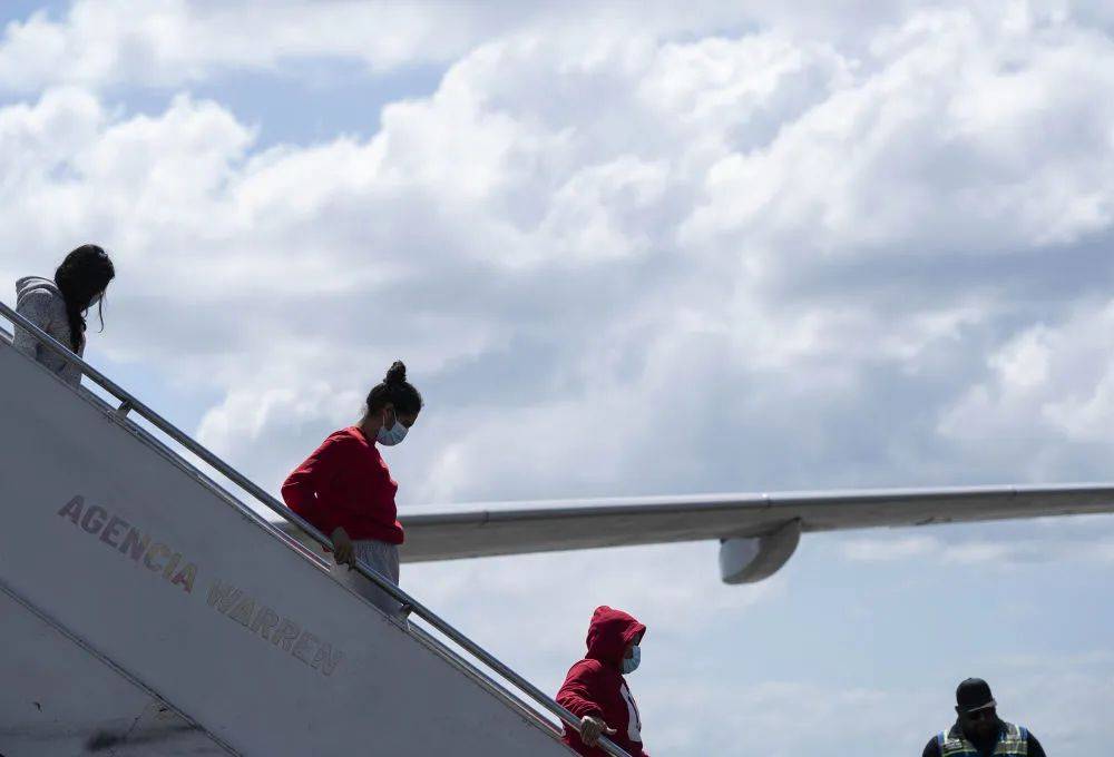 2月14日,在洪都拉斯西北部城市圣佩德罗苏拉的拉蒙·比列达·莫拉莱斯机场,返乡移民走下飞机。新华社发(戴维 摄)