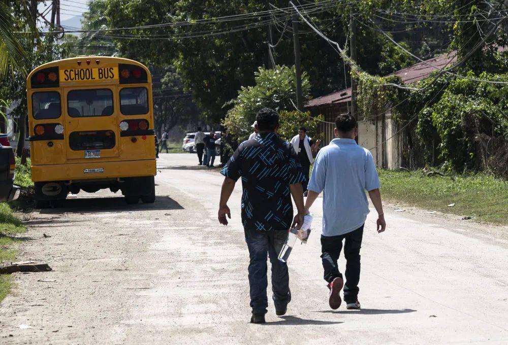 2月14日,在洪都拉斯西北部城市圣佩德罗苏拉,返乡移民乘坐返乡移民援助中心的巴士前往车站。新华社发(戴维 摄)