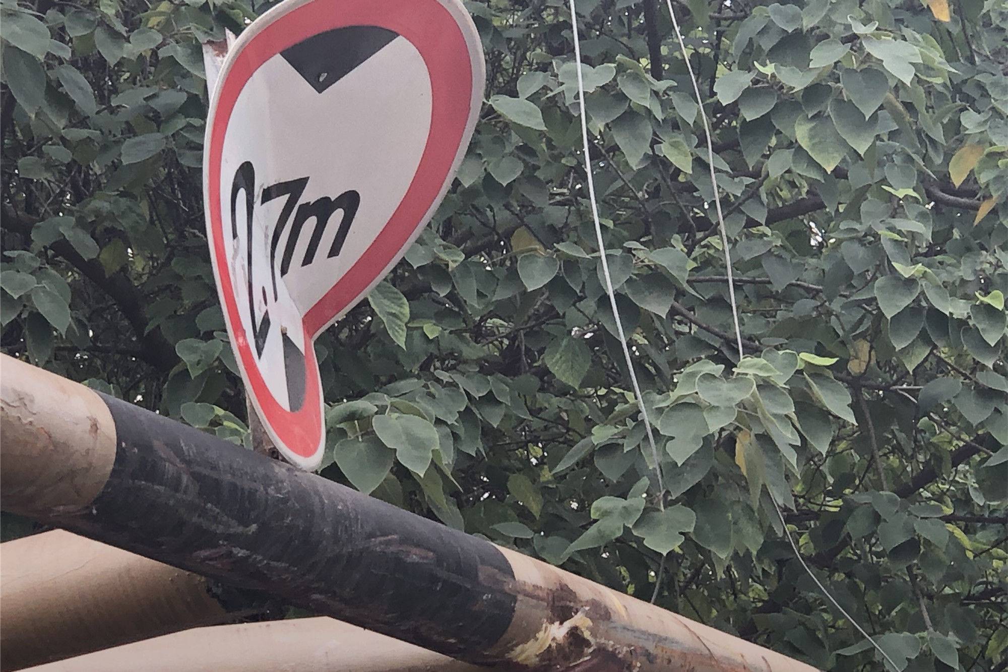 转身折返,准备穿过洋桥洞。只见洞前的限高杆伤痕累累,不难想象,它不知经受了多少次碰撞。